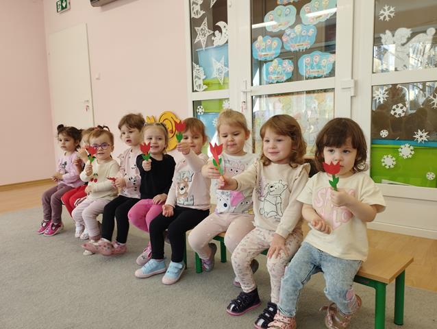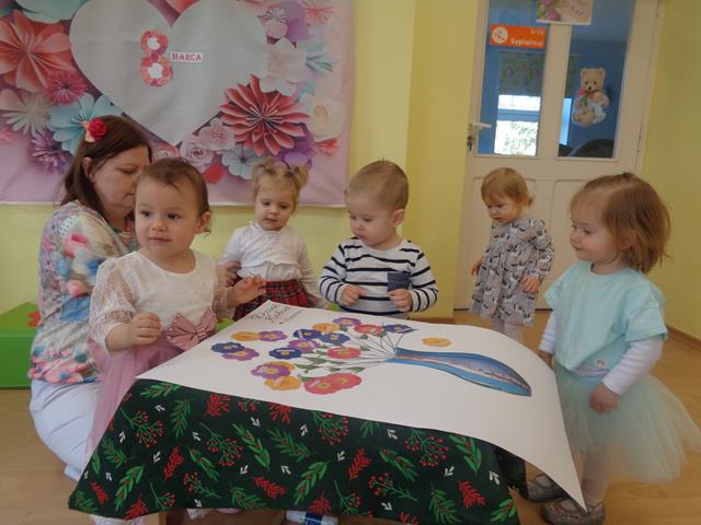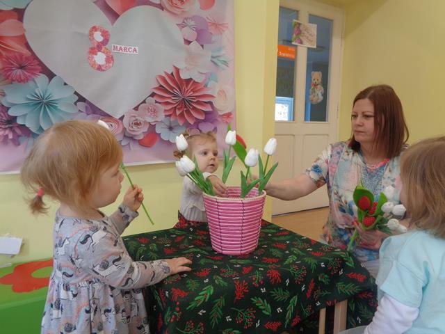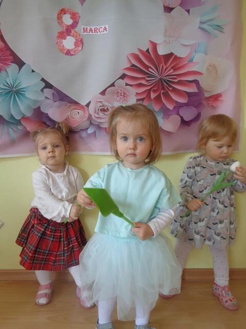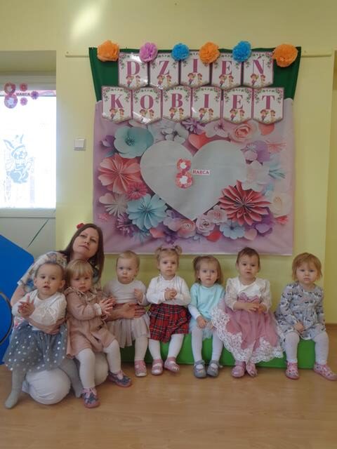 Święto Kobiet w naszym żłobku jest obchodzone bardzo uroczyście. Dzieci wzięły udział w specjalnie przygotowanych zabawach ruchowo-tanecznych, a inscenizacja do piosenki “Dzisiaj jest Dzień Kobiet”” bardzo spodobała się maluszkom. W tym szczególnym dniu dziewczynki mogły poczuć się wyjątkowo, chłopcy złożyli im życzenia i wręczyli kwiatki. Święto było także okazją do rozmów z dziećmi o roli kobiet w ich życiu – o mamusiach, babciach, koleżankach, a także o zawodach, które wykonują. Dzieci z grupy Krasnali przedstawiły paniom pracującym w placówce i zaproszonym gościom przepiękny program artystyczny i wręczyły upominki w postaci kolorowych kwiatków. W czasie zajęć plastycznych ćwiczyliśmy sprawność małych rączek poprzez wyklejanie kolorowych laurek.