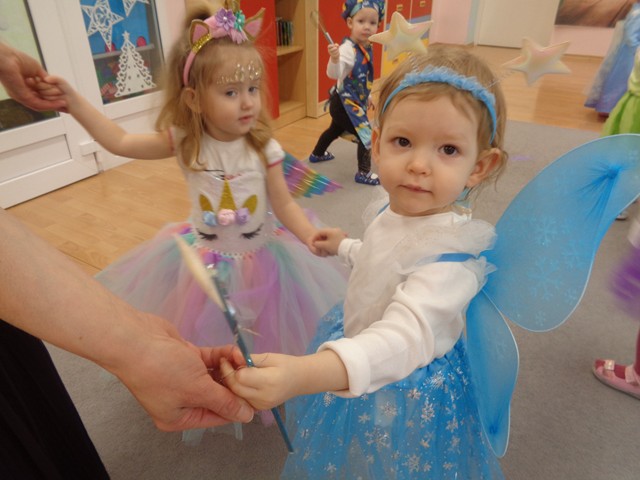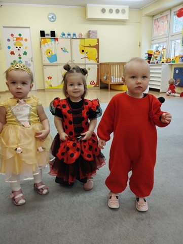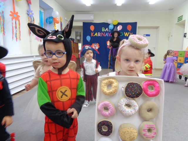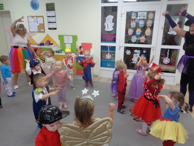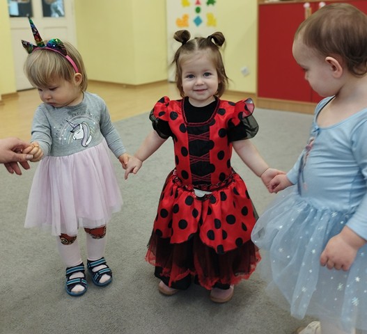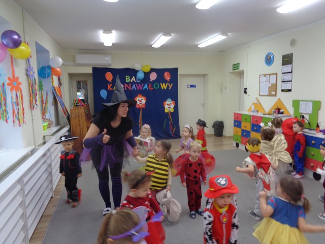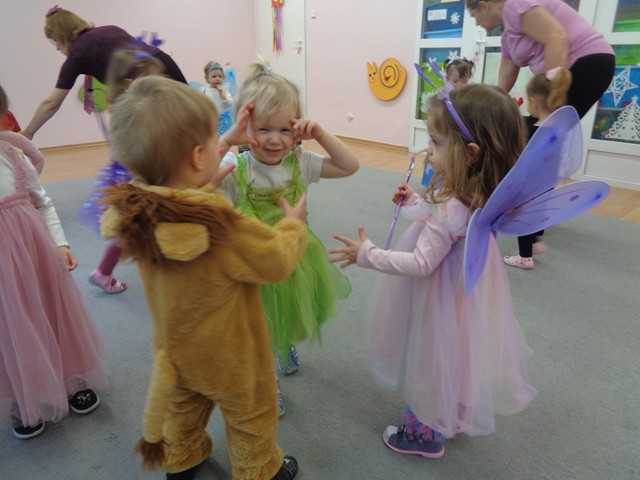 Dziś w naszym żłobku odbył się bal karnawałowy. W tym wyjątkowym dniu od rana na twarzach dzieci gościły uśmiechy. Maluszki przyszły poprzebierane w piękne i kolorowe stroje postaci z bajek. Wystrój sal wprowadził dzieci w radosny nastrój oraz zachęcił wszystkich do wesołej zabawy. Maluszki tańczyły w rytm ulubionych piosenek, chętnie brały udział w zabawach z chustą animacyjną, balonami i piłeczkami. Nie zabrakło pamiątkowych zdjęć.