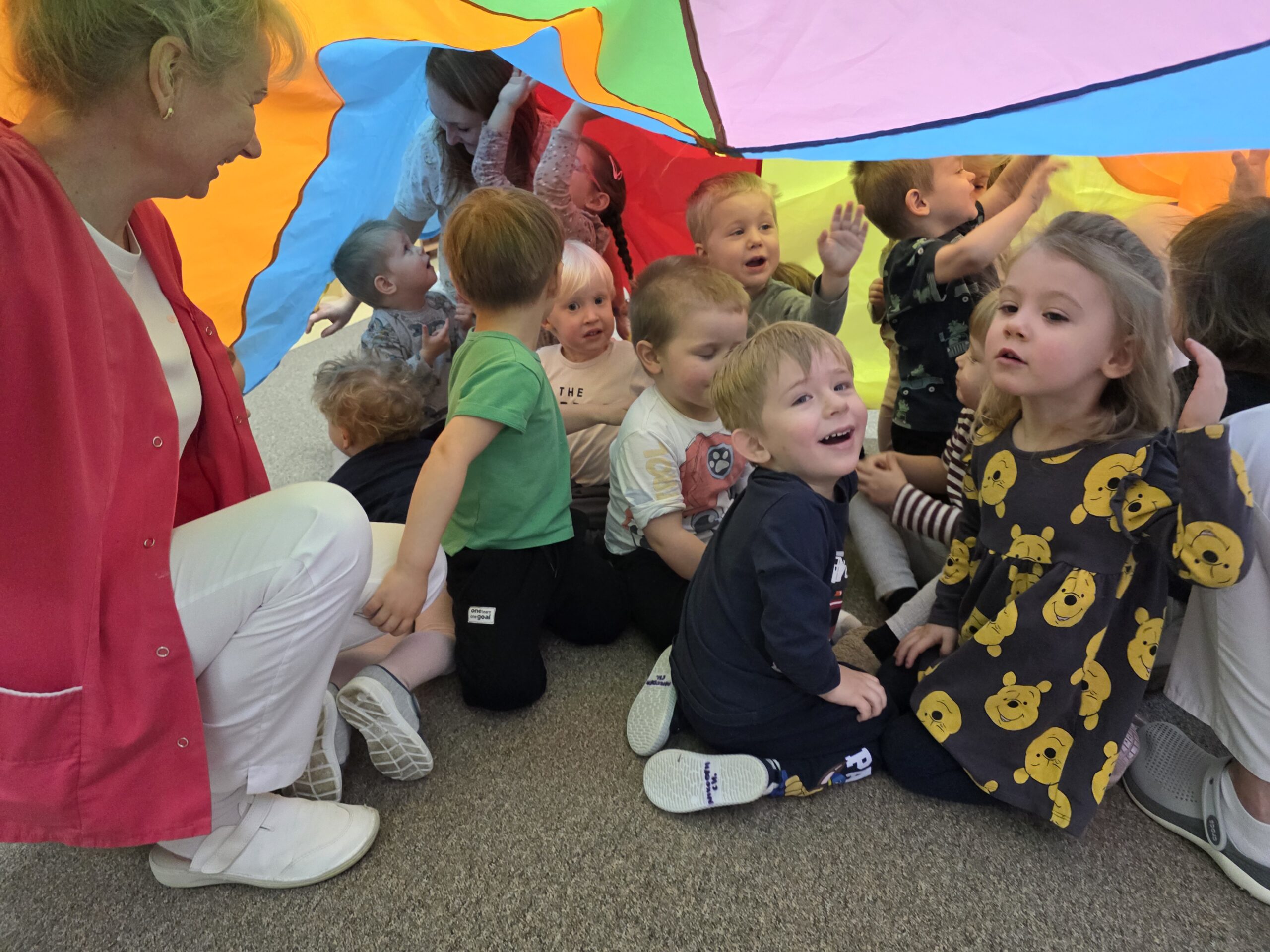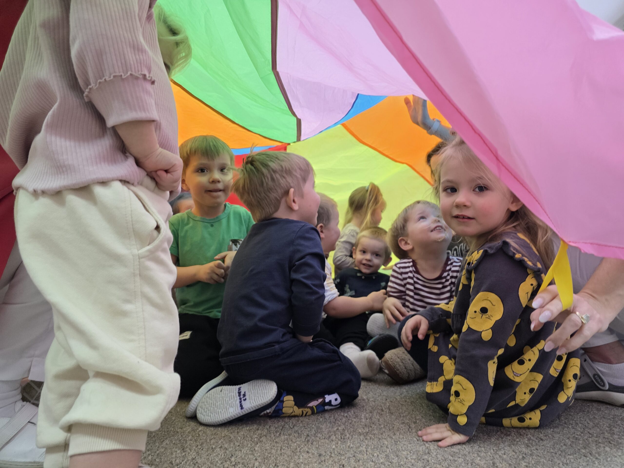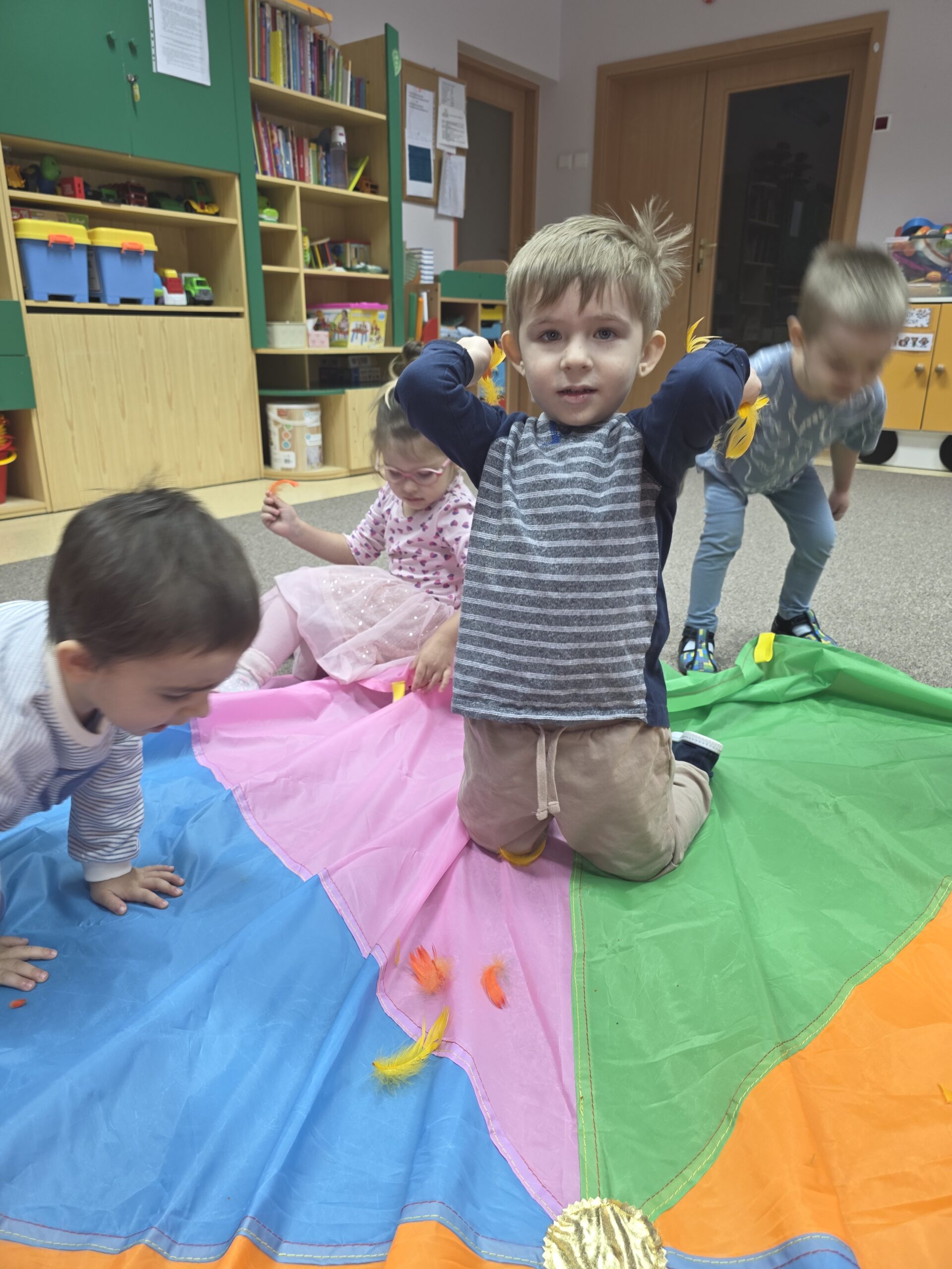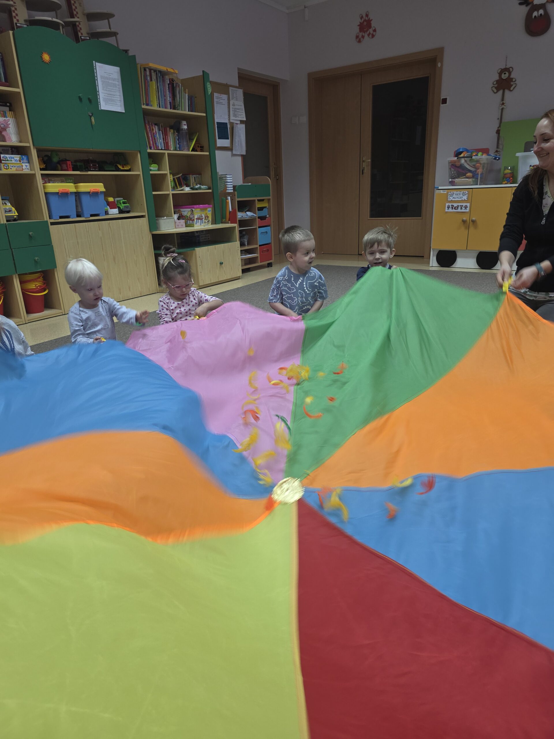 Na ostatnich zajęciach „Muchomorki” ćwiczyły współprace w grupie wykorzystując do tego chustę animacyjną. Dzieci trzymały chustę, kręciły się z nią, podrzucały piórka ale najwięcej radości sprawiło dzieciom chowanie się pod chustą.