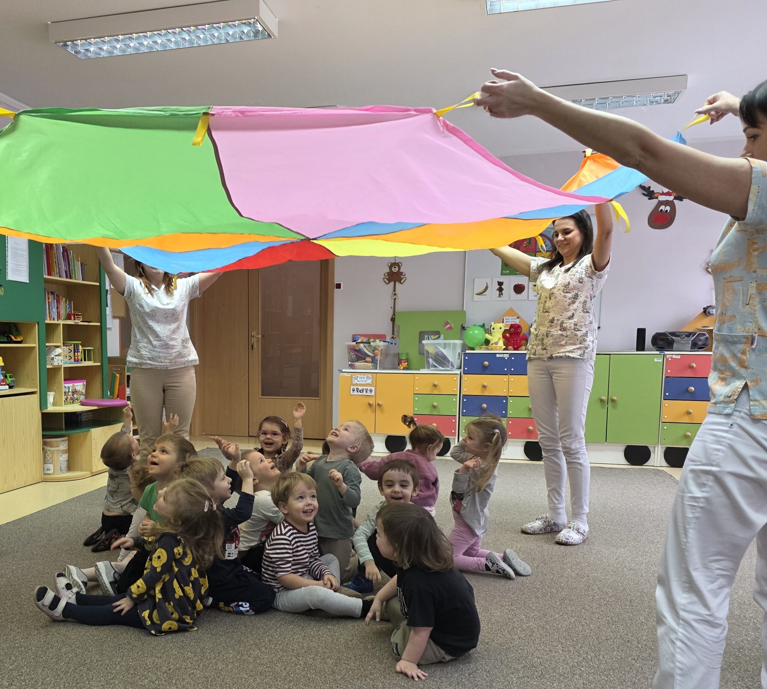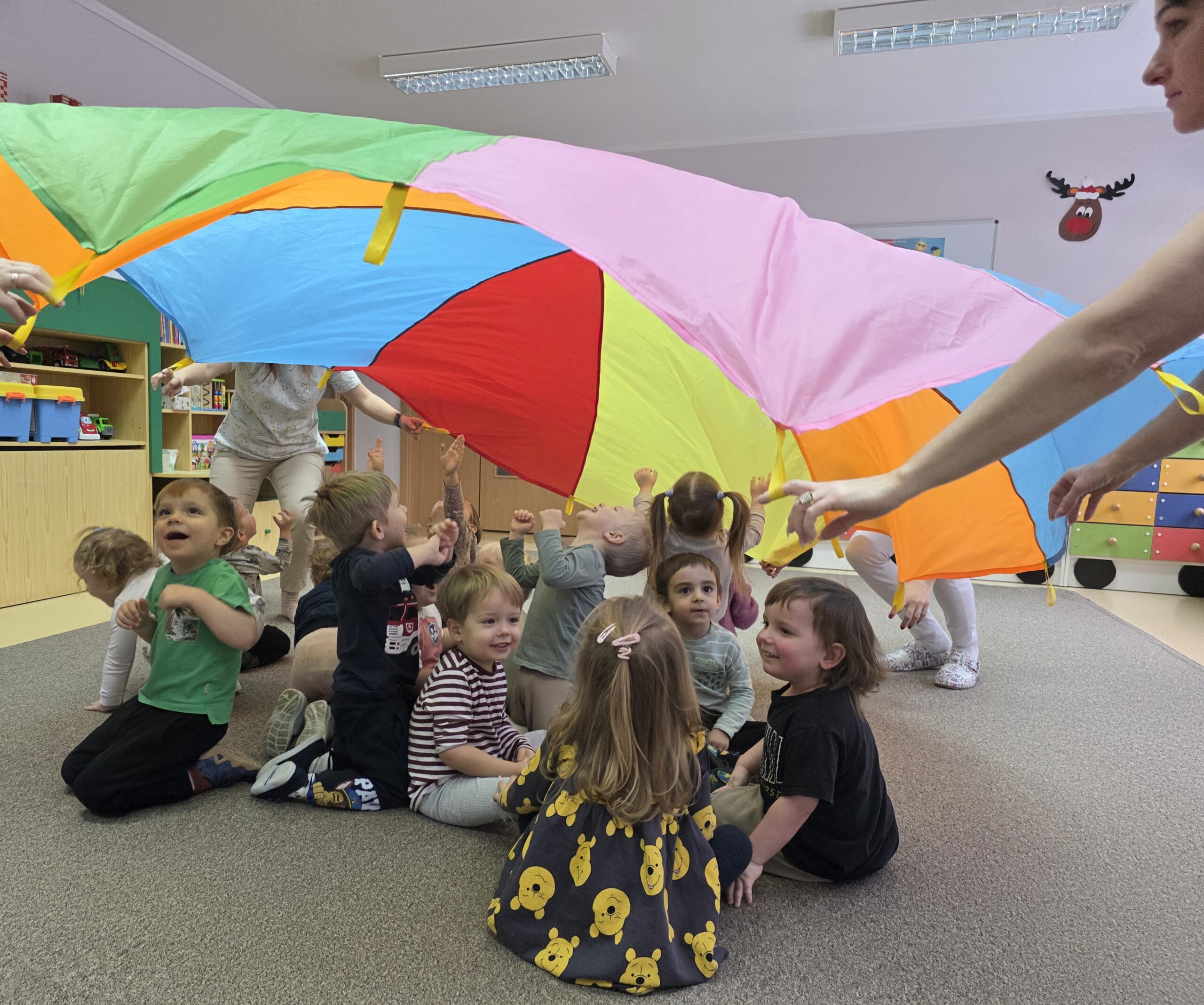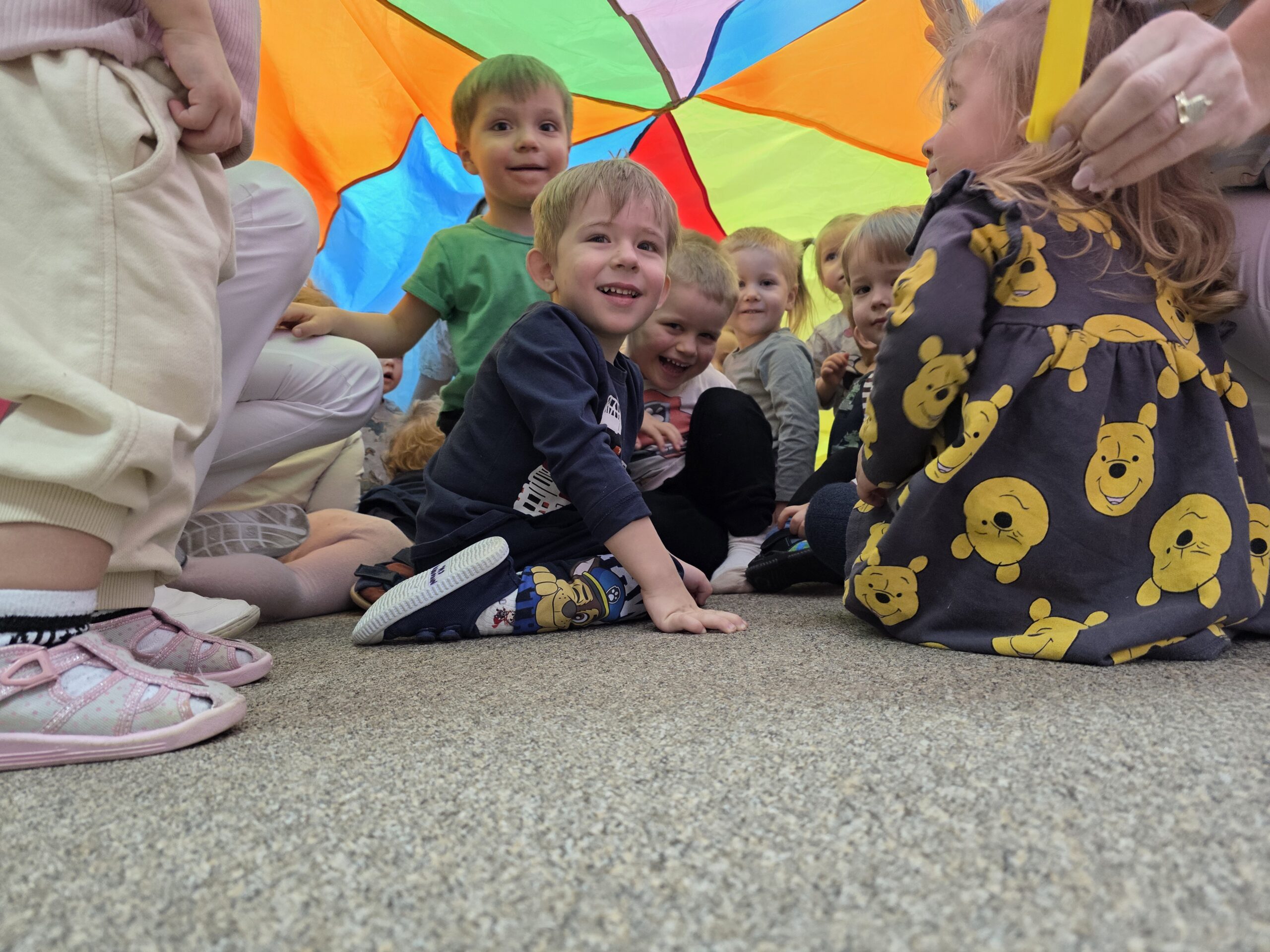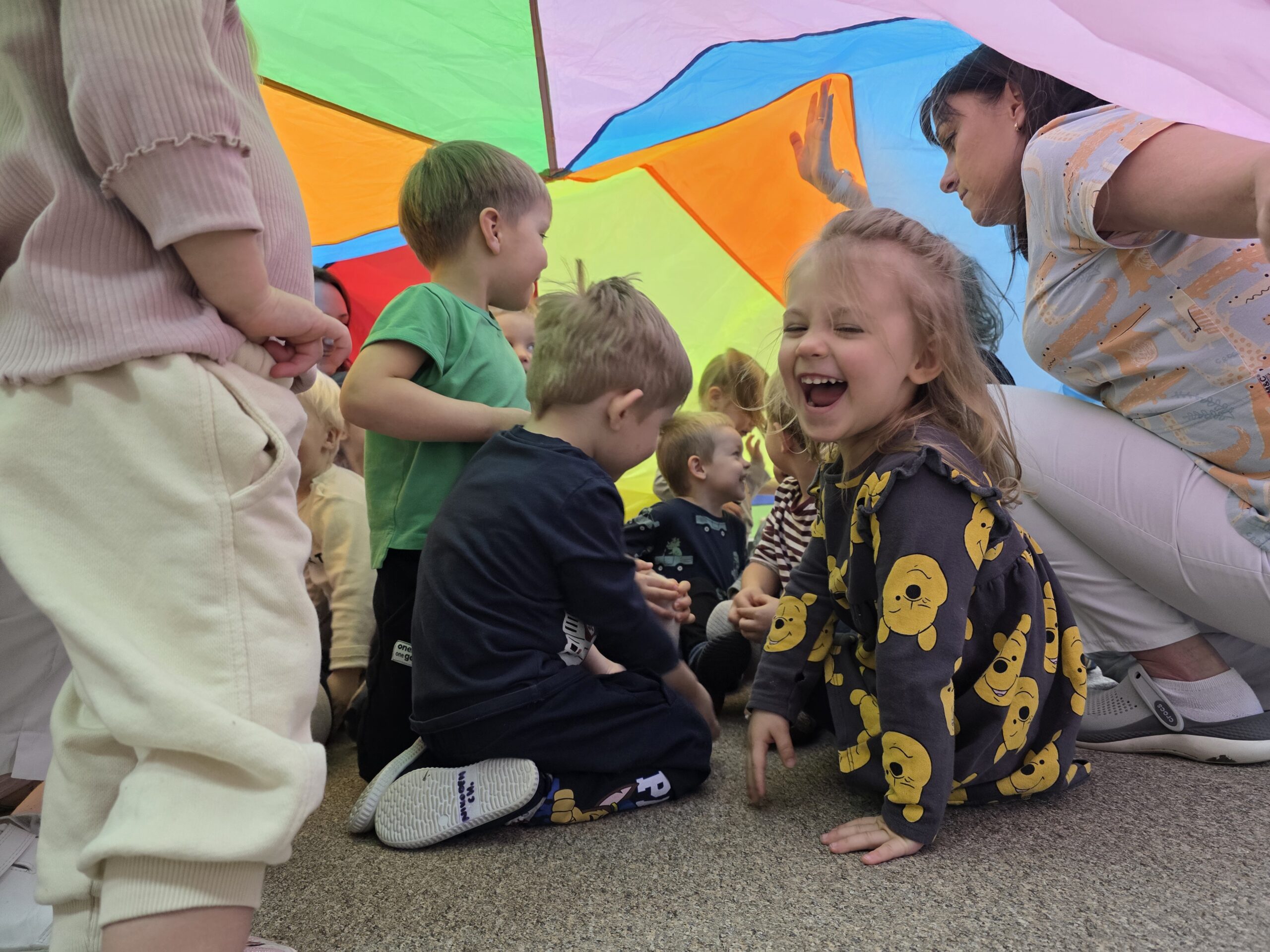 Na ostatnich zajęciach „Muchomorki” ćwiczyły współprace w grupie wykorzystując do tego chustę animacyjną. Dzieci trzymały chustę, kręciły się z nią, podrzucały piórka ale najwięcej radości sprawiło dzieciom chowanie się pod chustą.