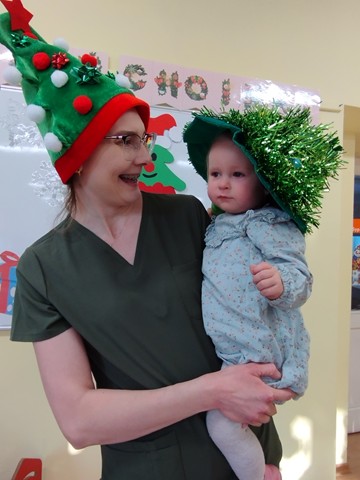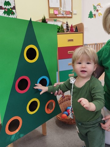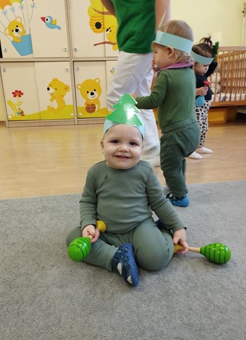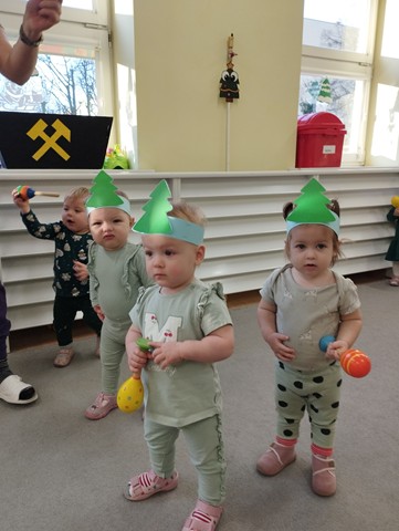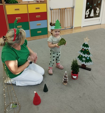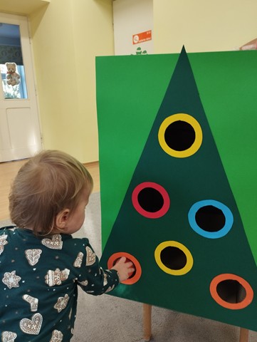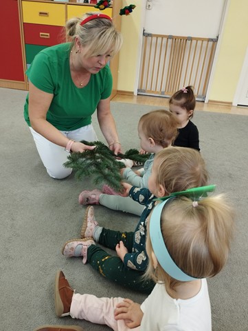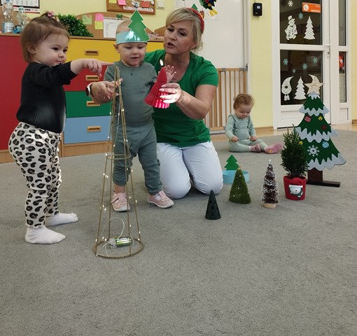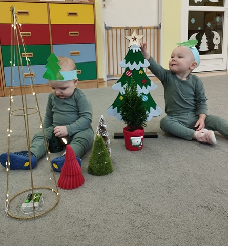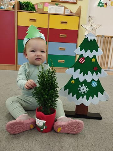 Maluszki z grupy „Raczki” wesoło obchodziły „Dzień Choinki”. Dzieci z ogromnym zaangażowaniem i zaciekawieniem badały fakturę kłujących gałązek, twardych i miękkich choinek wykonanych z łańcucha choinkowego, szyszek, silikonowych foremek czy też filcu. Podczas zabaw muzycznych maluszki radośnie tańczyły w opaskach z zielonym drzewkiem. Chętnie uczestniczyły w zabawie wrzucania piłeczek do otworów o tym samym kolorze. Na zakończenie zajęć każde dziecko przykleiło swoją gwiazdkę na choince. W tym dniu mogliśmy poczuć magię zbliżających się świąt.