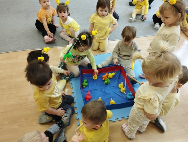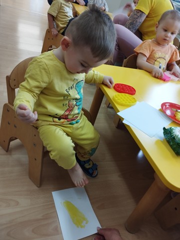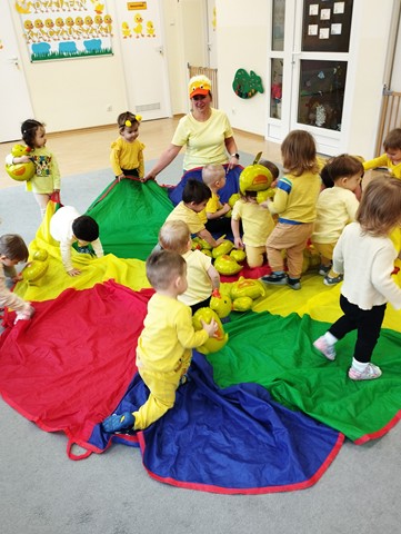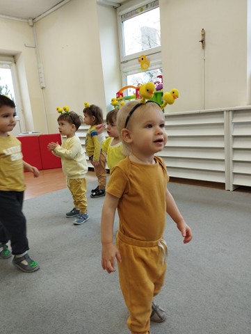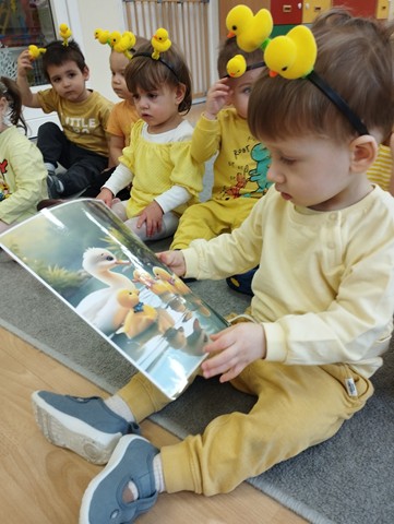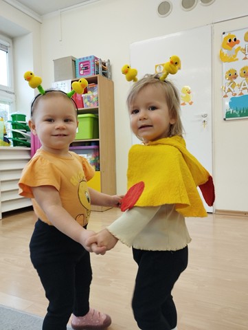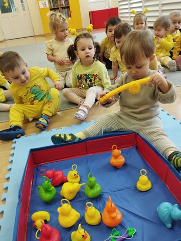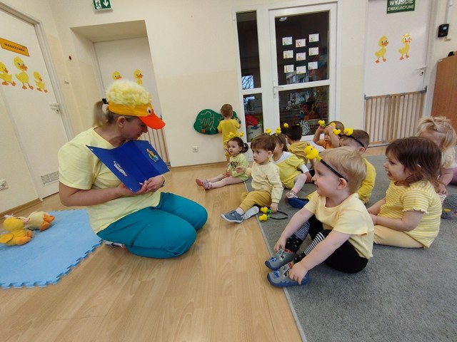 Dzień Kaczuszki to doskonała okazja do zabaw sensorycznych, ruchowych i plastycznych. Maluszki dowiedziały się jak wygląda to urocze zwierzątko, jaki ma kolor i jak się porusza.Nie zabrakło zabaw muzyczno-ruchowych do piosenek pt. „Kaczuchy stop!”, „Kaczki kwaczki”, „Gdzie jest moja mama?”. Dzieci z uwagą wysłuchały krótkiego opowiadania, a następnie bawiły się wesoło podczas łowienia gumowych kaczuszek. Maluszki wykonały też niezwykłą pracę plastyczną – odciskały pomalowanymi farbą stópkami sylwetę kaczuszki.