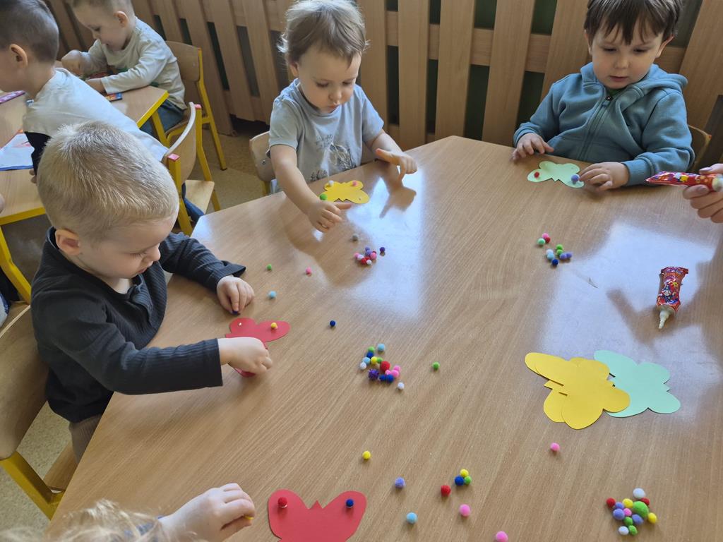 Dzieci wspólnie wykonały barwną pracę plastyczną przy pomocy papieru, kleju i pomponów.