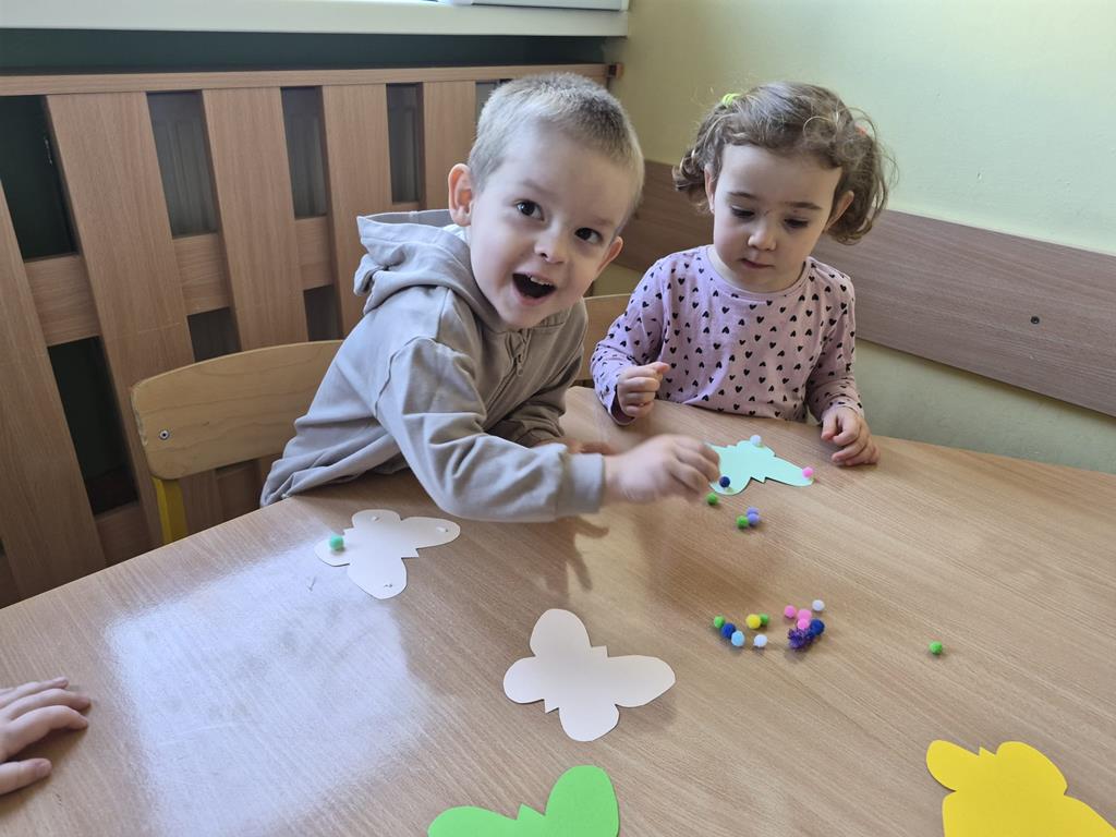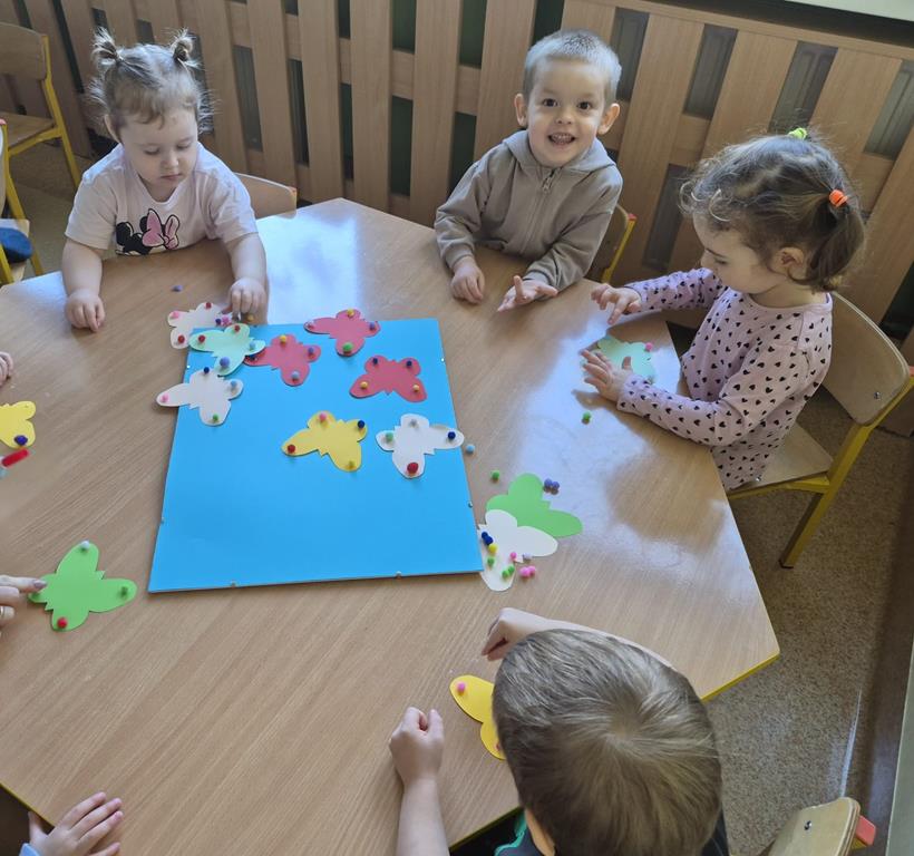 Zabawa w tym dniu rozpoczęła się od tańca motyli do piosenki: „Leci moty, leci”. Wesoła muzyka wypełniła nasz żłobek a maluszki unosiły się w rytm dźwięków naśladując ruchy motyli.