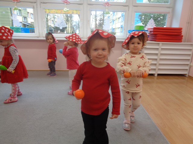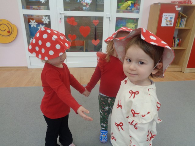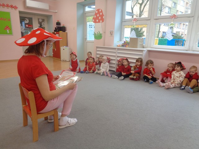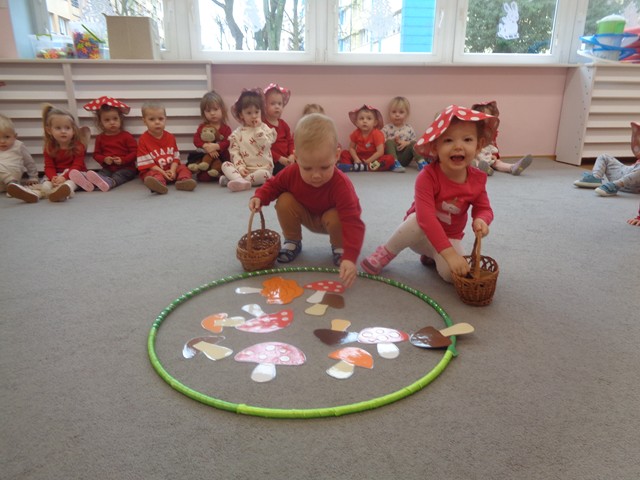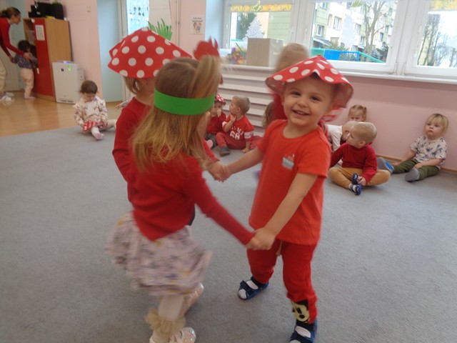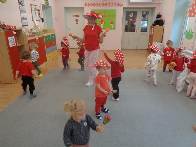 Z tej okazji dzieci w czerwonych czapeczkach tańczyły wesoło do piosenek o muchomorku. Maluszki z zainteresowaniem obejrzały przedstawienie kukiełkowe pt. „Kapelusz Muchomorka”. Wiele radości sprawiło dzieciom zbieranie papierowych grzybków do koszyczka.