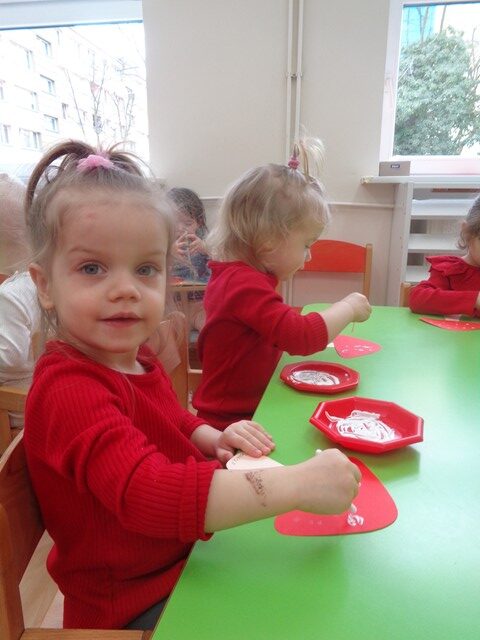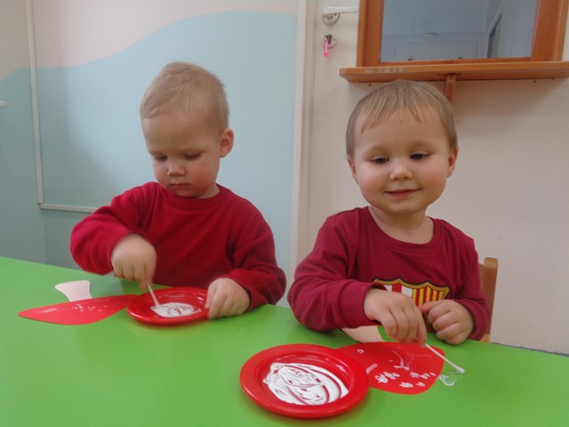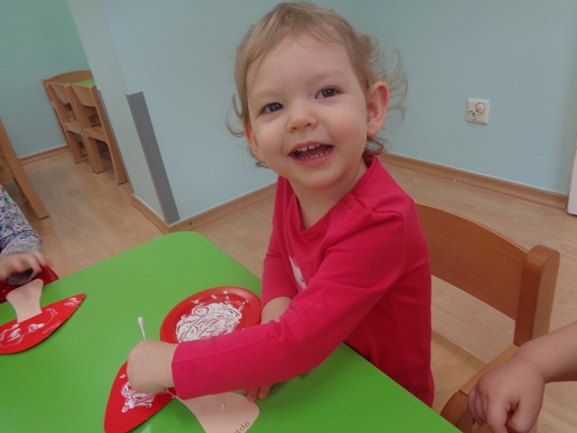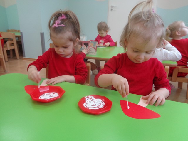 W czasie zabaw maluszki wykonały też pracę plastyczną ozdabiając białą farbą czerwone kapelusze. Celem zabaw było rozwijanie zainteresowań przyrodniczych, rozwijanie spostrzegawczości i kreatywności.