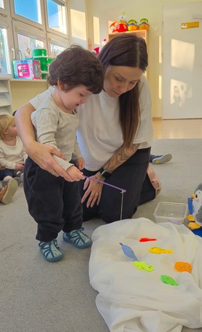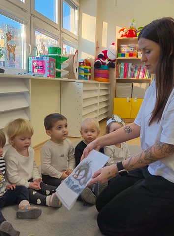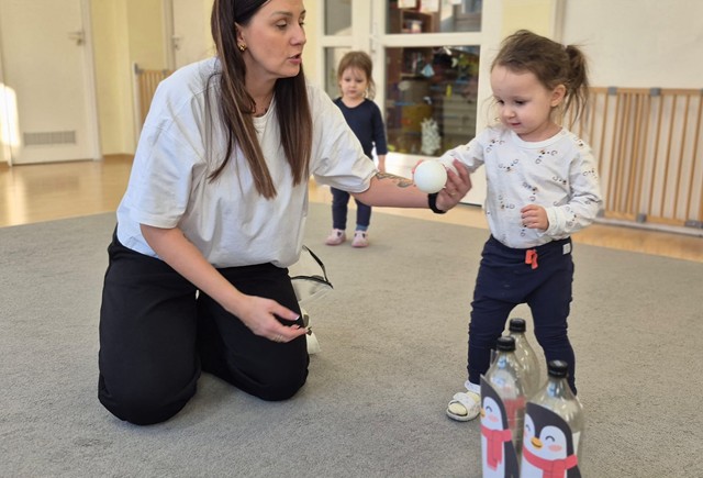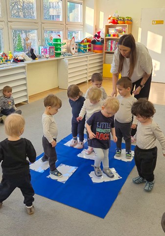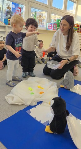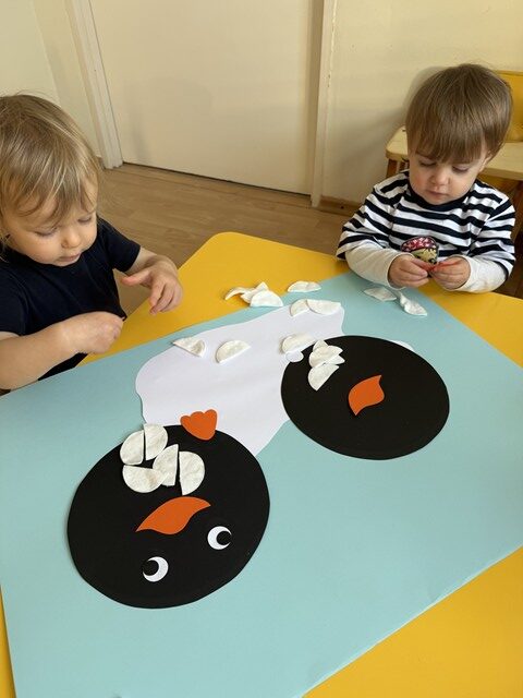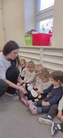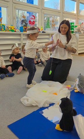 Tego dnia maluszki przyszły ubrane w biało-czarne stroje. Dzieci z chęcią uczestniczyły w zabawach muzyczno-ruchowych do piosenek pt. „Taniec pingwina”, „Ja jestem pingwin”, „Tip-top”. Maluszki grały w pingwinkowe kręgle, chodziły po lodzie i z wielkim zaangażowaniem próbowały złowić rybki,aby je nakarmić. Nie zabrakło również pracy plastycznej – dzieci wspólnie wyklejały pingwinki z gotowych elementów. Celem zabaw było rozwijanie sprawności ruchowej i koordynacji poprzez taniec oraz doskonalenie umiejętności manualnych.