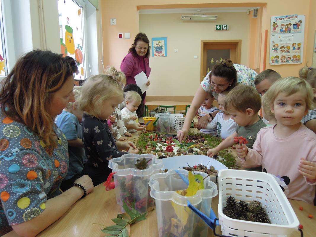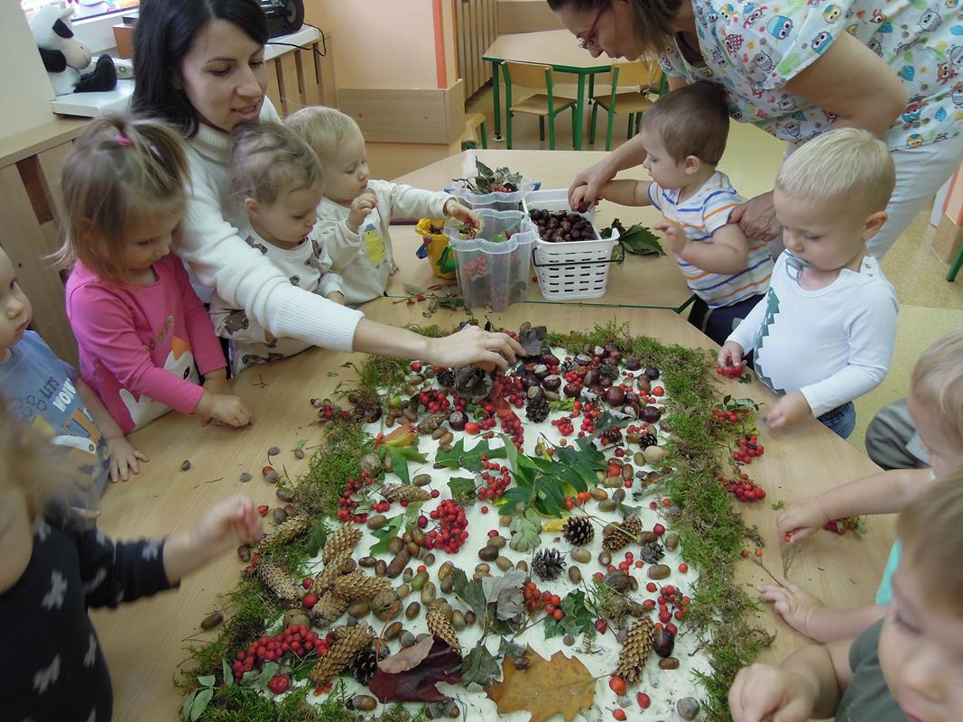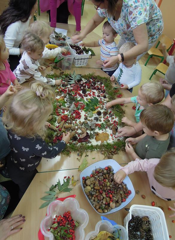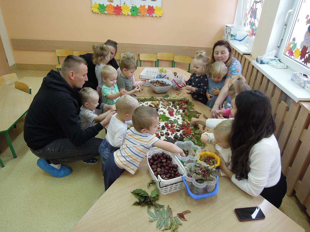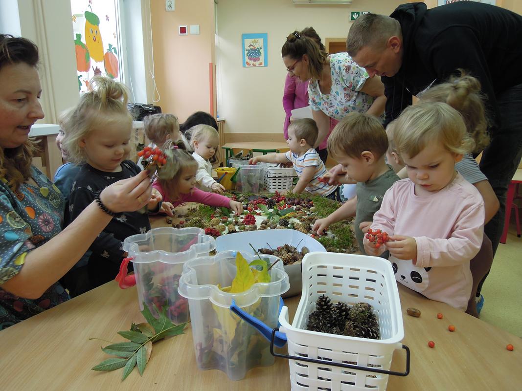 Praca plastyczna ,, Sensoryczna Jesień” została wykonana dnia 26.09.2025r. przez dzieci z III grupy żłobkowej ,,Krasnale”, a pomagali licznie przybyli Goście. Zapoznano dzieci z materiałami, które wykorzystano w pracy (mech, orzechy włoskie, kasztany, żołędzie, szyszki, jarzębinę, liście drzew i krzewów). Omówiono ich kolory, strukturę i nazwę. Każde dziecko miało możliwość dotykania ww. materiałów. Opiekun poprzez rozmowę przygotował dzieci do zadania – uzupełniania przygotowanym elementami sylwety drzewa. Praca sprawiła naszym maluszkom wiele radości. Wszystkim udzielił się radosny nastrój. Byliśmy dumni z naszego pięknego drzewa!