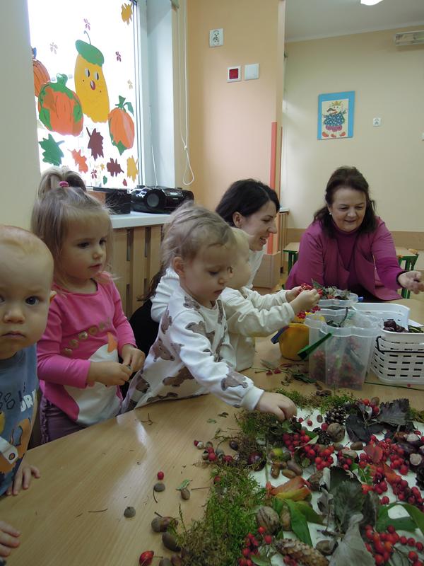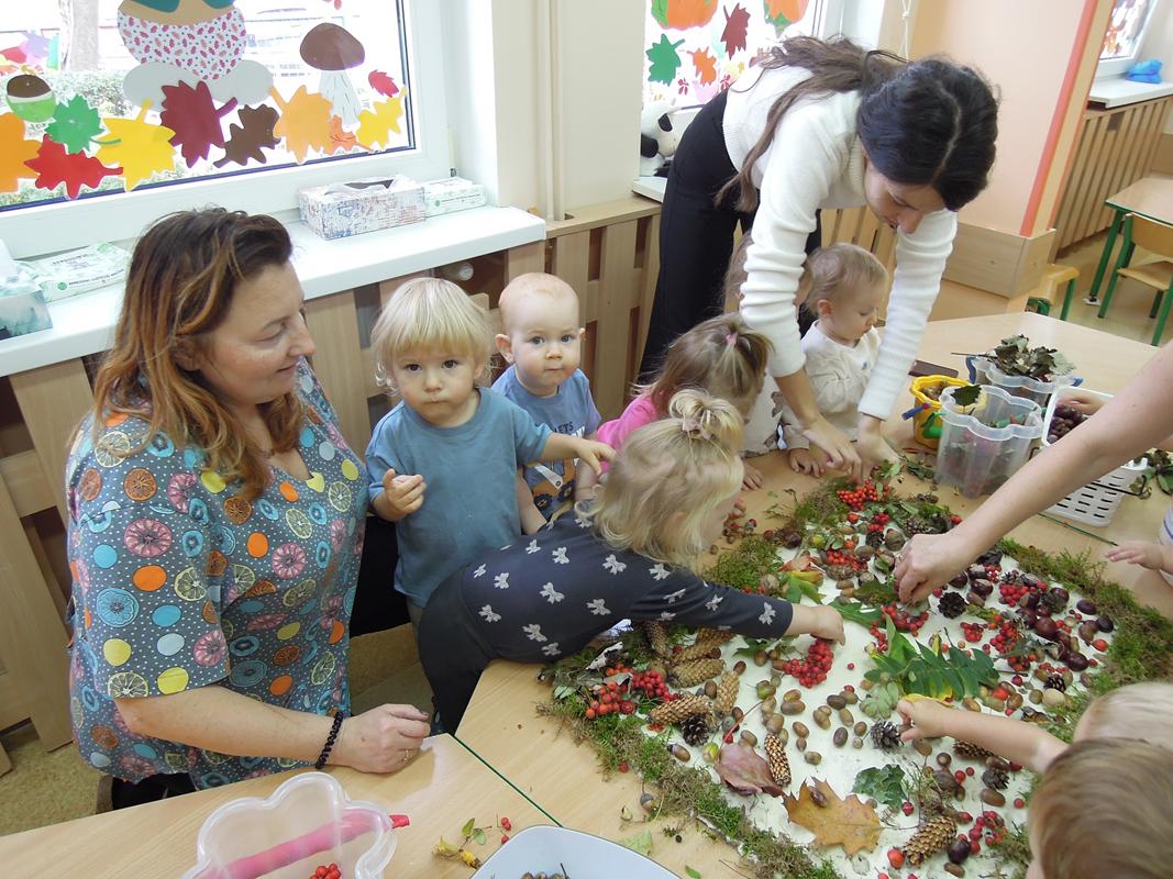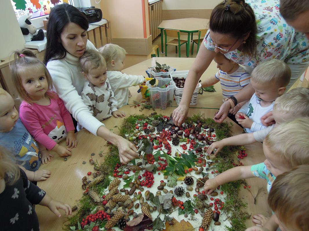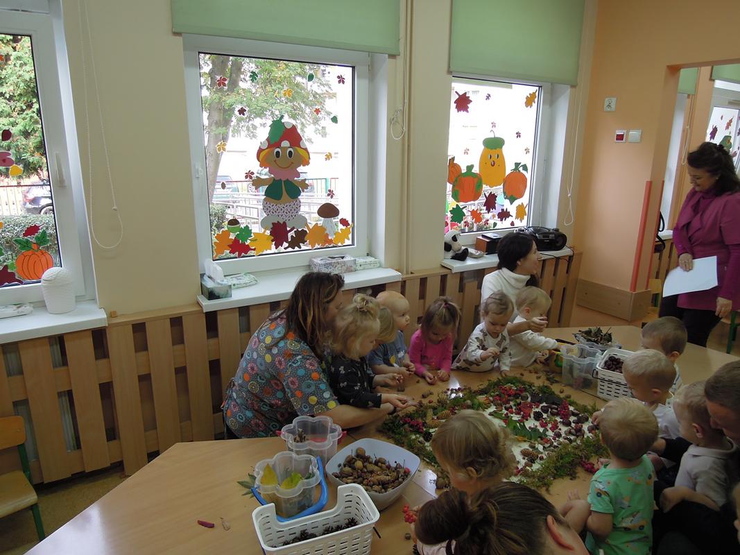 Praca plastyczna ,, Sensoryczna Jesień” została wykonana dnia 26.09.2025r. przez dzieci z III grupy żłobkowej ,,Krasnale”, a pomagali licznie przybyli Goście. Zapoznano dzieci z materiałami, które wykorzystano w pracy (mech, orzechy włoskie, kasztany, żołędzie, szyszki, jarzębinę, liście drzew i krzewów). Omówiono ich kolory, strukturę i nazwę. Każde dziecko miało możliwość dotykania ww. materiałów. Opiekun poprzez rozmowę przygotował dzieci do zadania – uzupełniania przygotowanym elementami sylwety drzewa. Praca sprawiła naszym maluszkom wiele radości. Wszystkim udzielił się radosny nastrój. Byliśmy dumni z naszego pięknego drzewa!