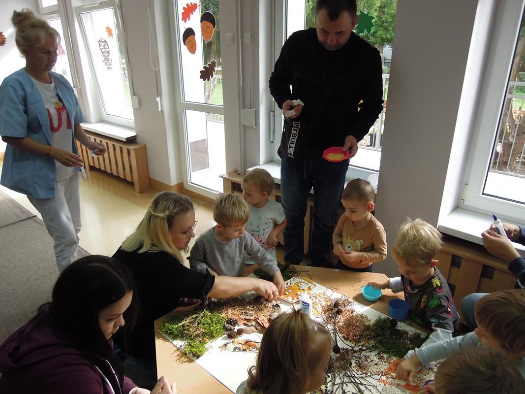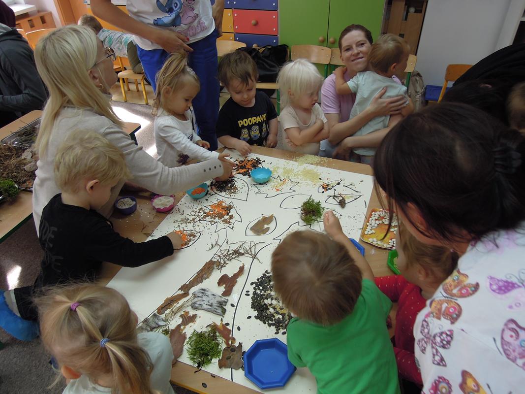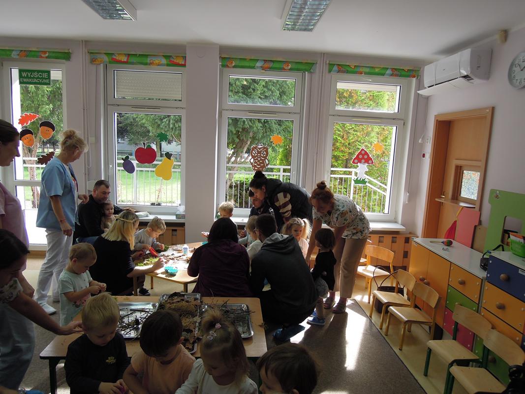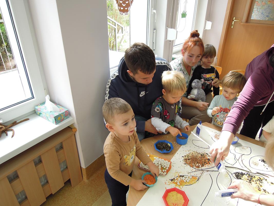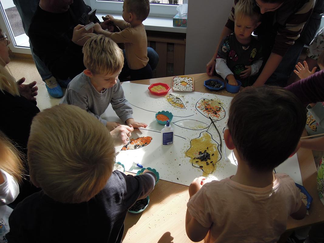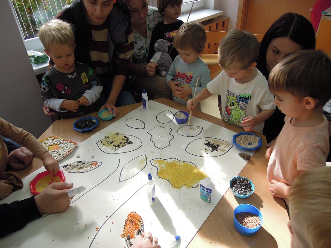 Praca na konkurs ,, Sensoryczna Jesień” została wykonana dnia 26.09.2025r. przez dzieci z III grupy żłobkowej ,, Muchomorki” , a pomagali – licznie przybyli goście. Zapoznano dzieci z materiałami , które wykorzystano w pracy ( mech, korę, patyczki, pestki dyni, ciecierzycę, ryż, kaszę gryczaną, fasolę, płatki owsiane, makaron, kaszę jęczmienną i jaglaną, szyszki, słonecznik, gałązki z krzaków tui, gałązki sosny). Omówiono ich kolory, strukturę i nazwę. Każde dziecko miało możliwość dotykania ww. materiałów. Opiekun poprzez rozmowę przygotował dzieci do zadania – uzupełniania przygotowanym elementami sylwety drzewa. Praca sprawiła naszym maluszkom wiele radości. Wszystkim udzielił się wesoły nastrój. Byliśmy dumni z naszego pięknego drzewa! Miłym Gościom bardzo dziękujemy za przybycie i wspólną zabawę.