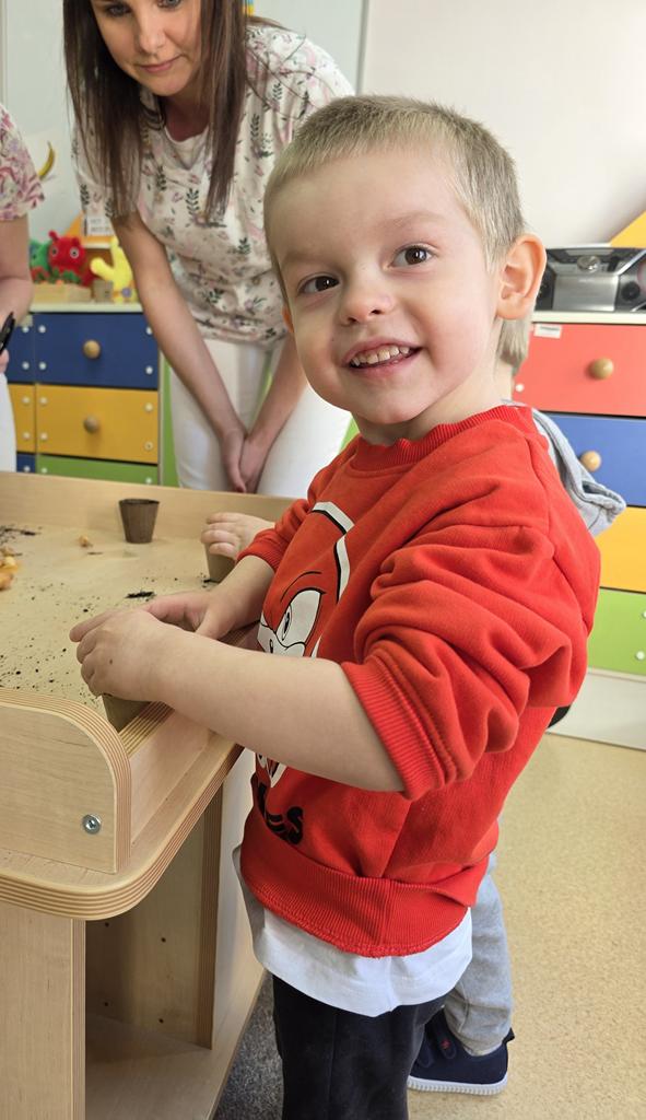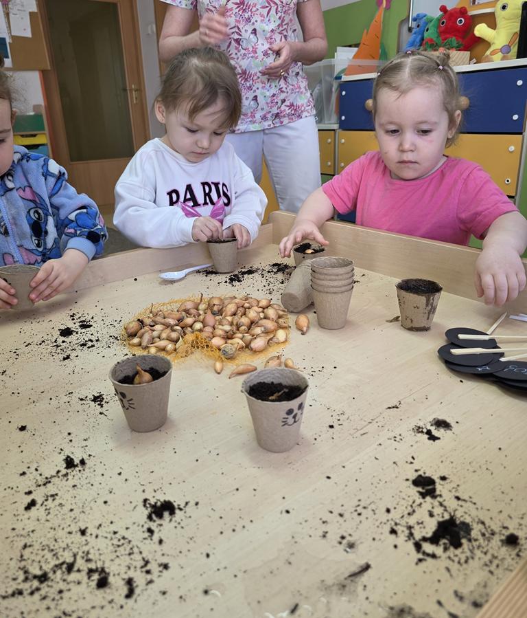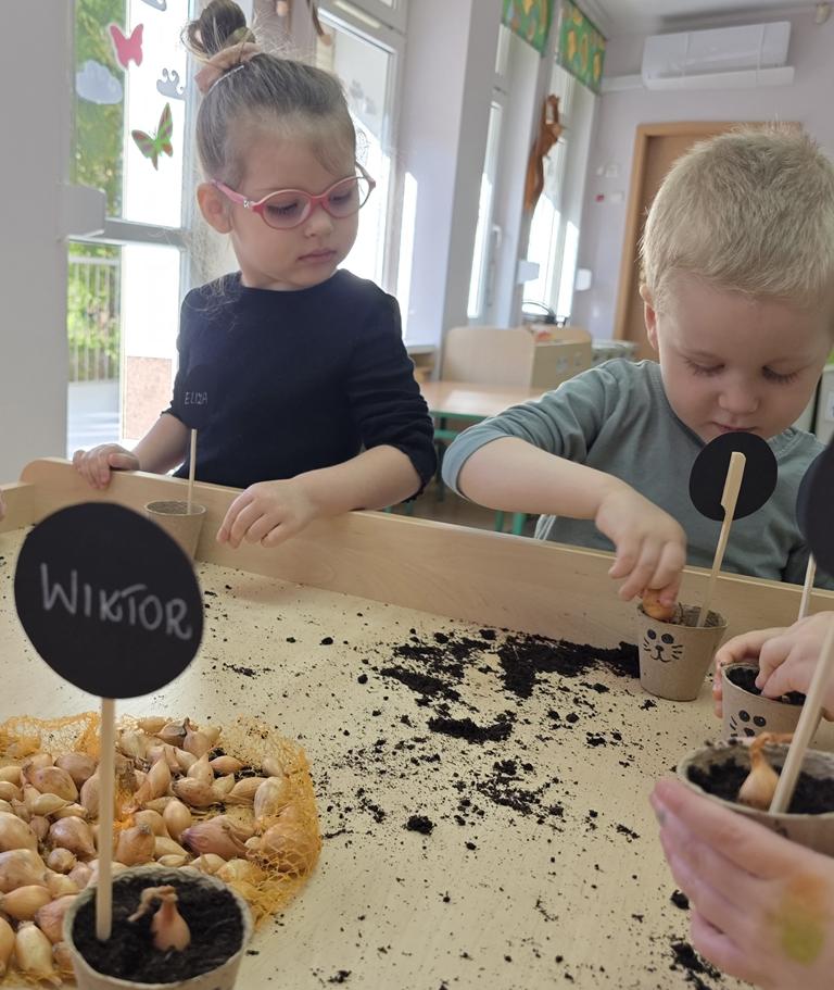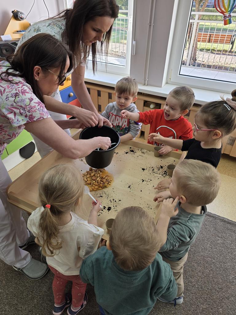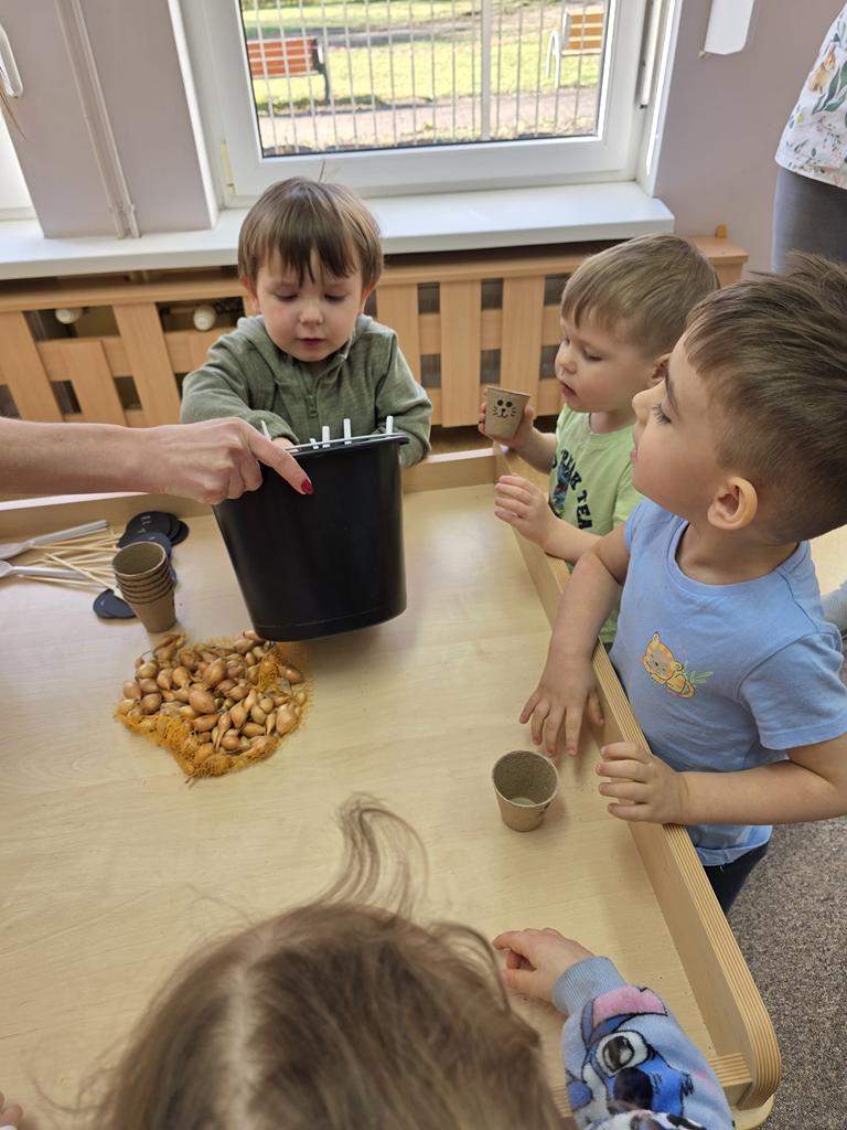 Dzieci otrzymały swoją doniczkę, ziemię oraz cebulkę a z pomocą opiekunów wsypywały ziemię, robiły małe dołki i umieszczały w nich cebulki, które również podlały.