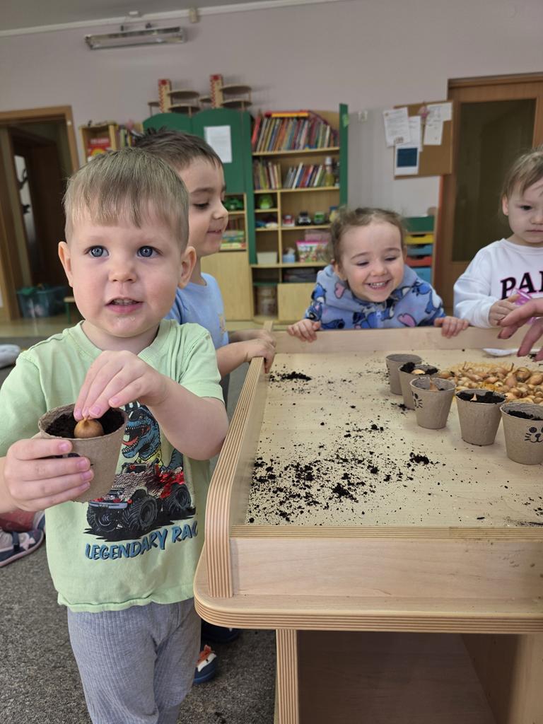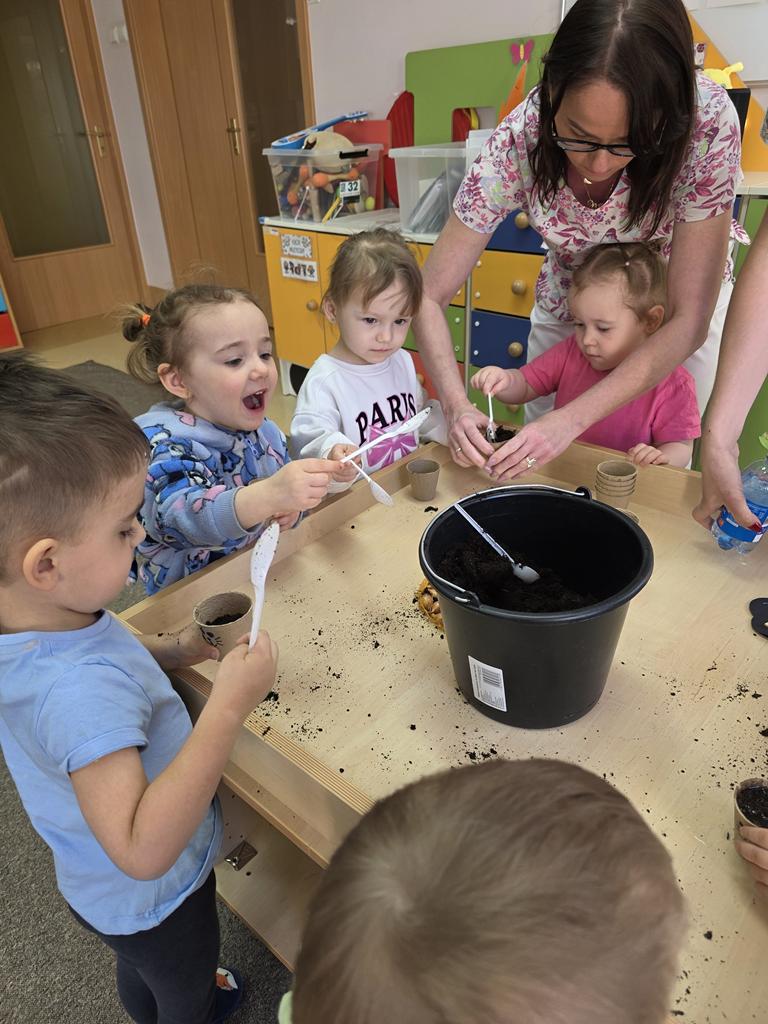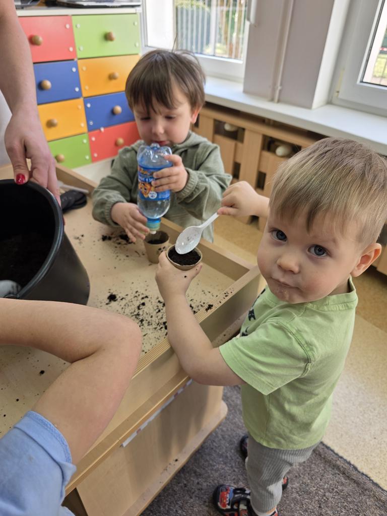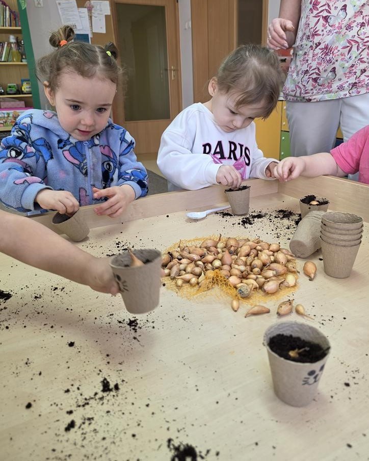 Dzieci otrzymały swoją doniczkę, ziemię oraz cebulkę a z pomocą opiekunów wsypywały ziemię, robiły małe dołki i umieszczały w nich cebulki, które również podlały.