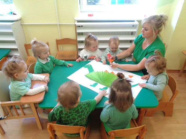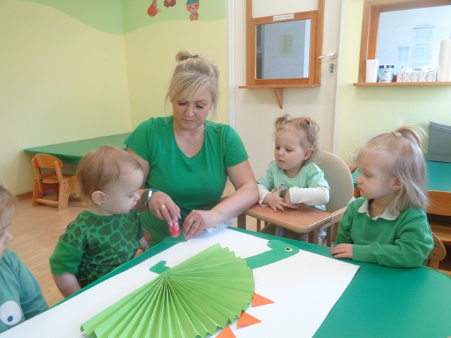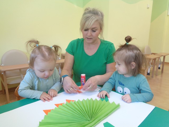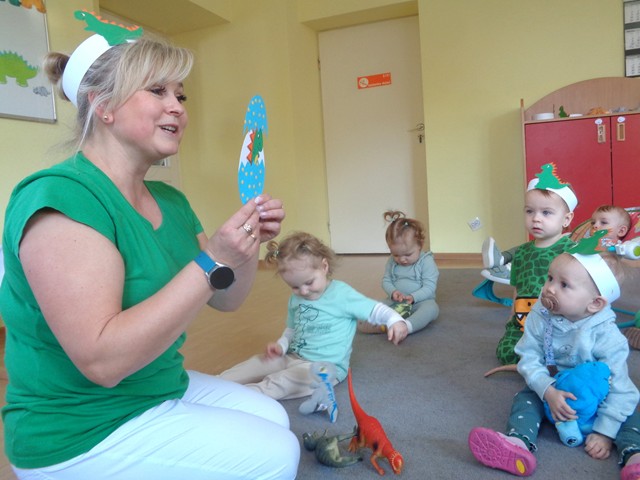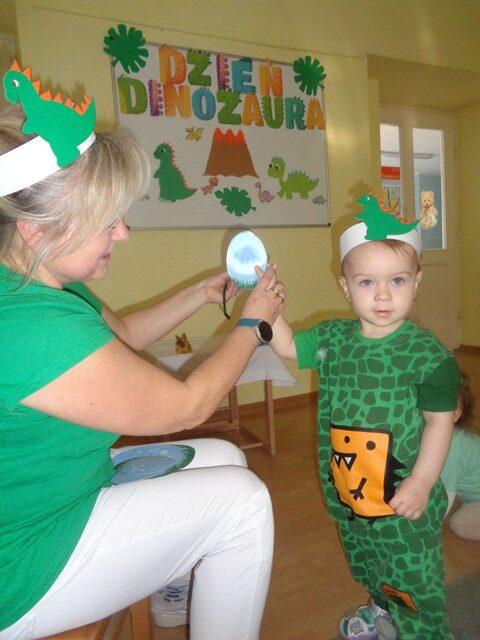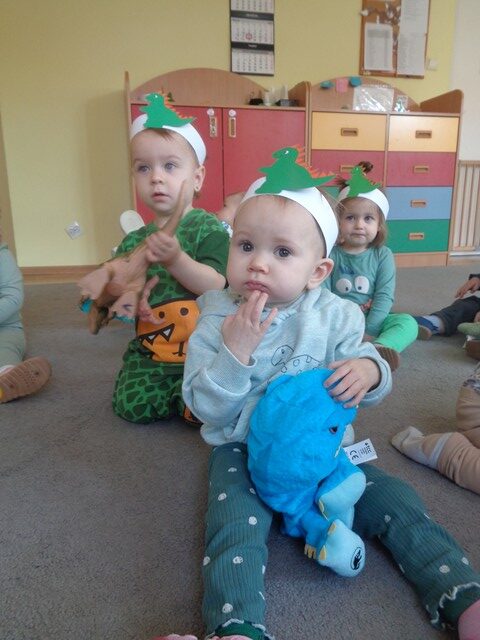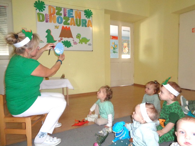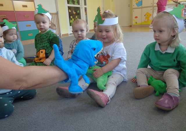 W czasie zajęć zabawowych maluszki z grupy Raczków dowiedziały się jak wyglądały dinozaury, co lubiły jeść, gdzie mieszkały. Dzieci z ciekawością wysłuchały opowiadania o „Dinusiu”, który szukał przyjaciela, z chęcią chodziły po śladach prehistorycznych zwierząt. Maluszkom bardzo spodobała się zabawa badawcza, w czasie której odkrywały sylwety dinozaurów. Dzieci z radością brały też udział w zabawach muzycznych, tańcząc z opaskami na głowie, a także z zaangażowaniem naśladowały ruchy zwierząt głośno tupiąc. Na zakończenie zabawy maluszki wykonały pracę plastyczną pt. „Przyjaciel Dinuś”.
