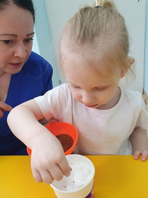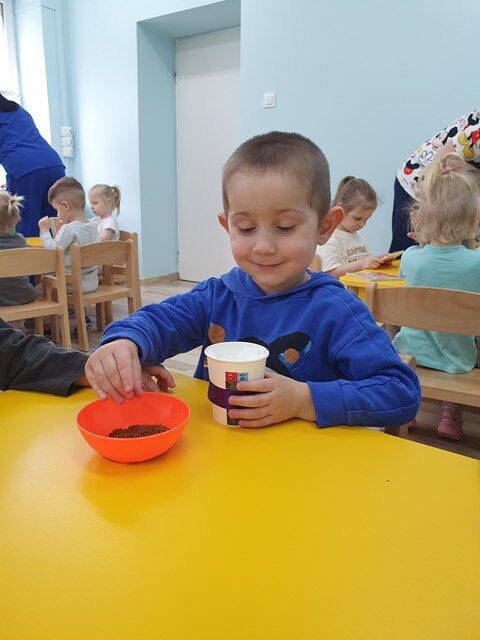 z różnorodnymi fakturami: szorstkimi nasionami, miękką watą oraz wodą. Dzieci samodzielnie przygotowywały podłoże, ucząc się precyzji ruchów i koordynacji wzrokowo-ruchowej.