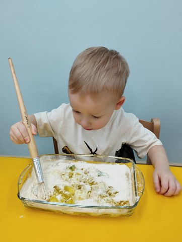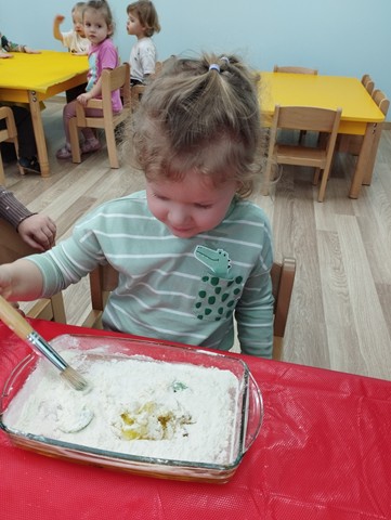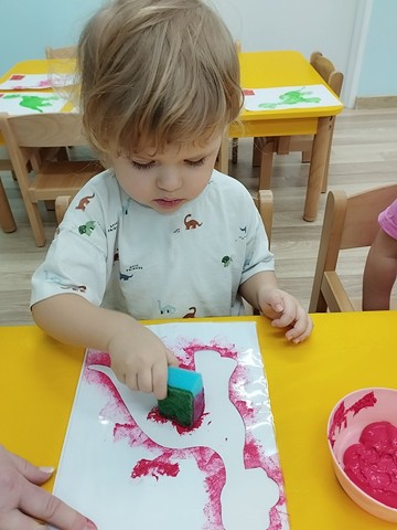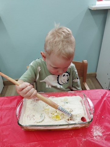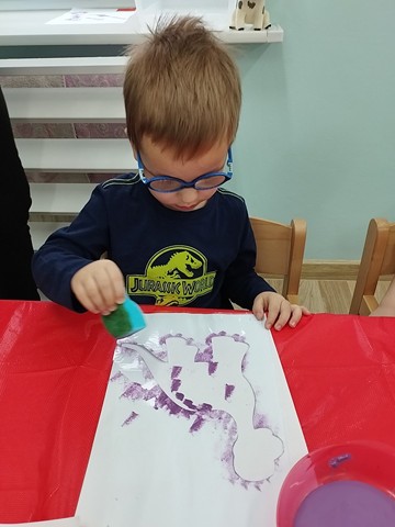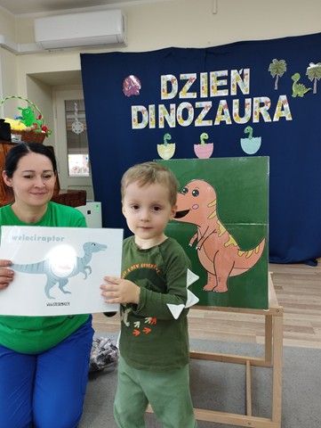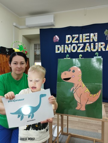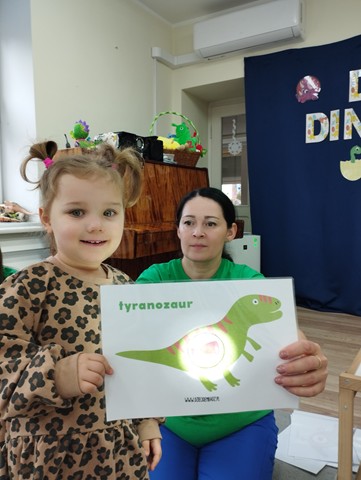 Dzień Dinozaura był dla naszych Krasnali pełen odkryć i radości. Dzieci poznały prehistoryczny świat i wzięły udział w wielu ciekawych aktywnościach. Z pomocą latarek dowiedziały się co jadły te wyjątkowe stworzenia, a prawdziwą atrakcją okazała się zabawa sensoryczna w wykopaliska. Nasi mali odkrywcy wcielili się w role paleontologów i z wielkim zaangażowaniem odnajdywali ukryte w mące szkielety dinozaurów. Maluszki stworzyły też piękne prace plastyczne – za pomocą gąbki z farbą stemplowały sylwety prehistorycznych stworzeń. Celem zabaw było rozbudzanie zainteresowań dzieci, pobudzanie wyobraźni, rozwijanie spostrzegawczości oraz zdolności motorycznych.