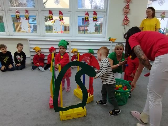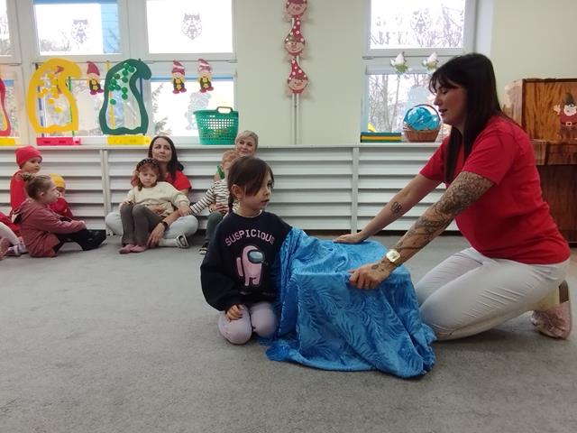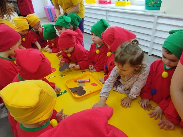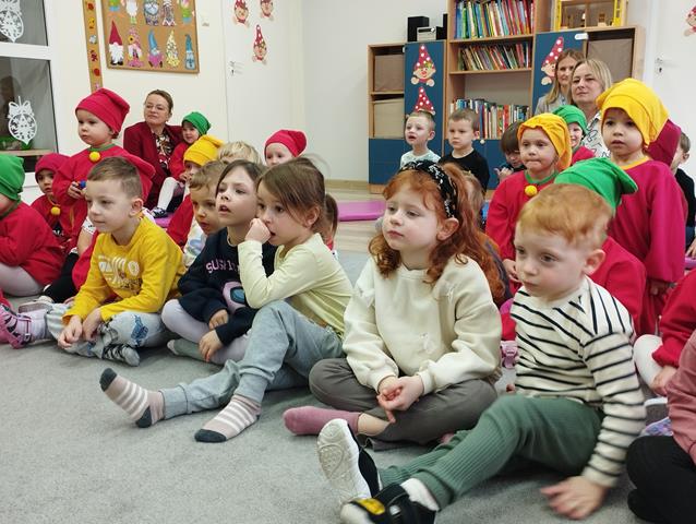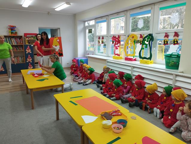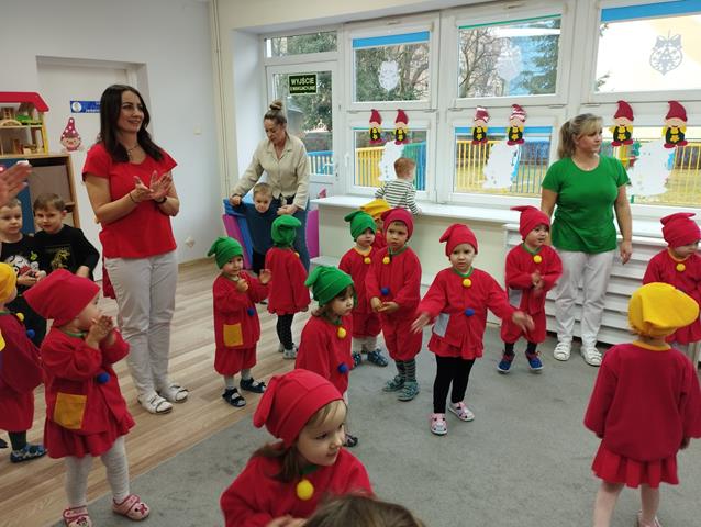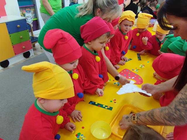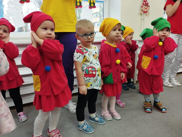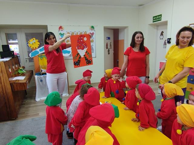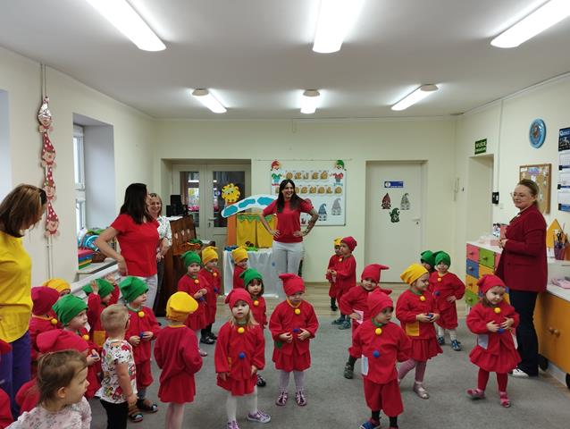 Z okazji Święta Krasnala zaprosiliśmy do żłobka wyjątkowych gości – dzieci z Przedszkola Nr 9 w Lubinie. Nasze Krasnale przywitały przedszkolaków piosenką „Wszyscy są”, a następnie wspólnie z gośćmi obejrzały teatrzyk. Dzieci chętnie brały udział w zabawie “Czapka krasnala”, podczas której przyklejały kolorowe kulki do dużych czapek krasnoludków. W czasie spotkania rozwijaliśmy także twórczą inicjatywę oraz pomysłowość, czego efektem były piękne i kolorowe prace plastyczne. Dziękujemy gościom z Przedszkola Nr 9 za miłą wizytę i wspólną zabawę w radosnej atmosferze.