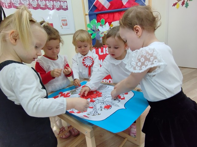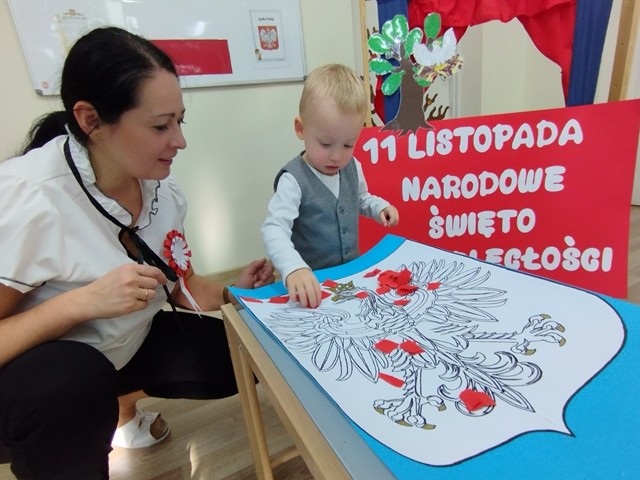 W naszym żłobku uroczyście obchodziliśmy Narodowe Święto Niepodległości. To wyjątkowy czas dla każdej Polki i Polaka. Dzieci wysłuchały wiersza pt. „Katechizm polskiego dziecka”, a także zapoznały się ze znaczeniem symboli narodowych. Na zakończenie zajęć dzieci wspólnie wyklejały tło godła polskiego.