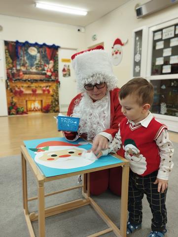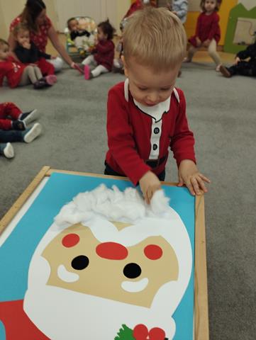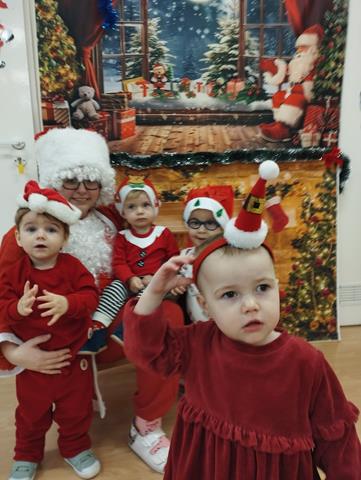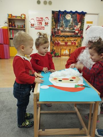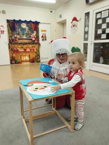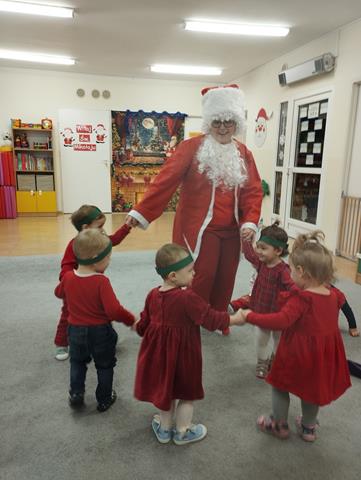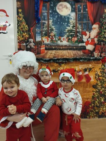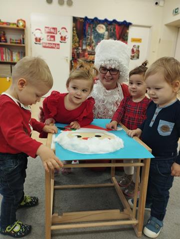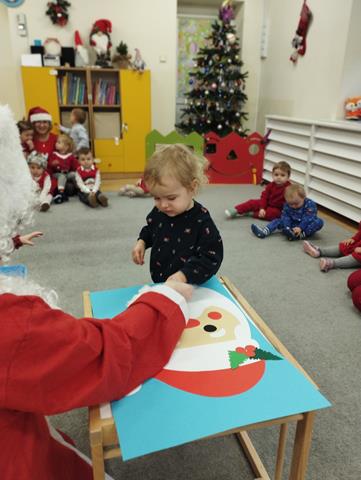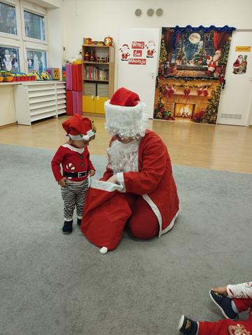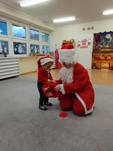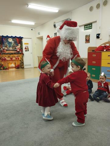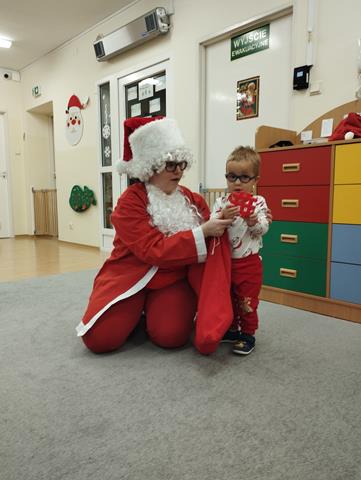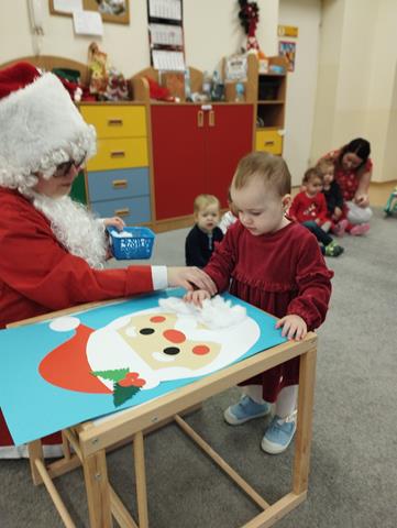 Zgodnie z tradycją 6 grudnia dzieci odwiedził św. Mikołaj. Maluszki powitały niezwykłego gościa świąteczną piosenką pt.”Mikołaj jedzie samochodem” i zaprosiły do wspólnej zabawy. Św. Mikołaj przybył do żłobka z workiem pełnym prezentów. Atmosfera spotkania była magiczna i wprowadziła wszystkich w radosny klimat zbliżających się Świąt Bożego Narodzenia.