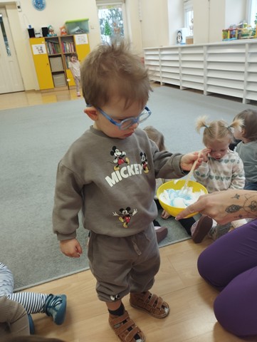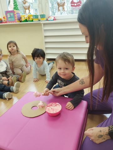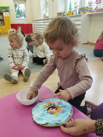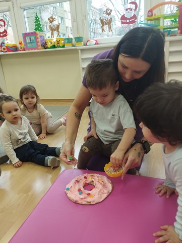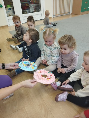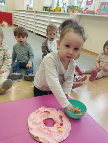 Tłusty czwartek stał się inspiracją do twórczych działań i rozwijania zdolności manualnych u dzieci. Maluszki z grupy Kaczuszek z zaciekawieniem oglądały ilustracje przedstawiające różne rodzaje pączków, z chęcią dekorowały donaty za pomocą kolorowej pianki i papierowej posypki. Celem zabaw było zapoznanie dzieci z tradycją tłustego czwartku, budowanie radosnej atmosfery oraz ćwiczenie motoryki małej.