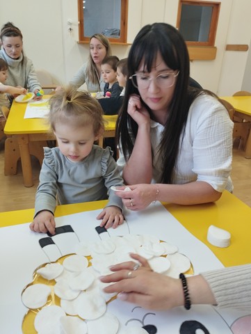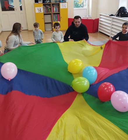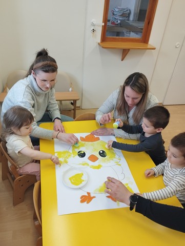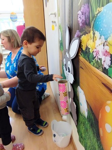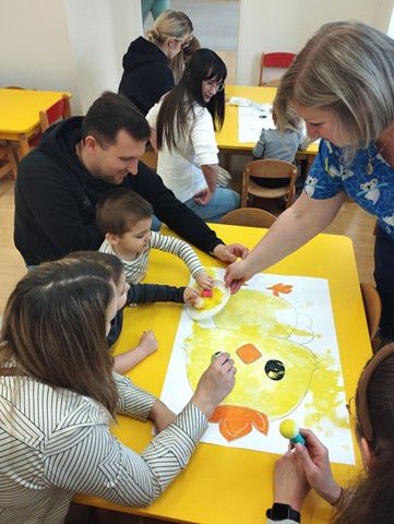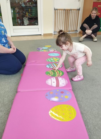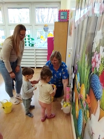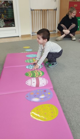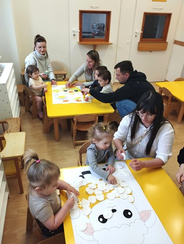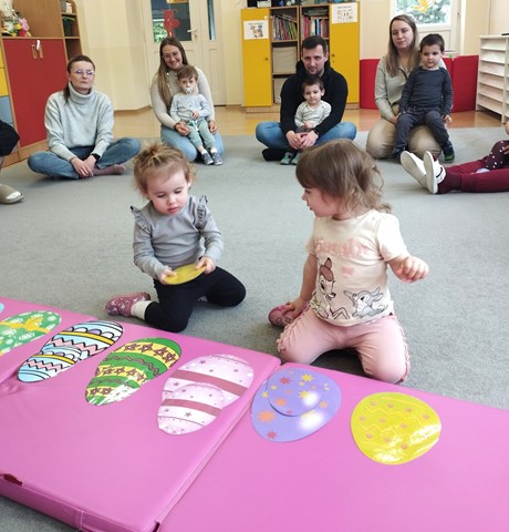 Przedświąteczne spotkanie z Rodzicami stało się doskonałą okazją do wspólnej zabawy i integracji. Zajęcia rozpoczęliśmy od zabaw tanecznych do piosenek „Bo idzie Wiosna”, „Kłótnia w koszyczku” oraz „Zając długie uszy ma”. Dużo uśmiechu dostarczył wszystkim teatrzyk pt. „Wielkanoc”, który opowiadał o przygotowaniach do Świąt Wielkanocnych. Nie zabrakło też tematycznych zadań dla maluszków – dzieci ze skupieniem dobierały w pary kolorowe pisanki i brały udział w zręcznościowej zabawie z króliczkiem.
