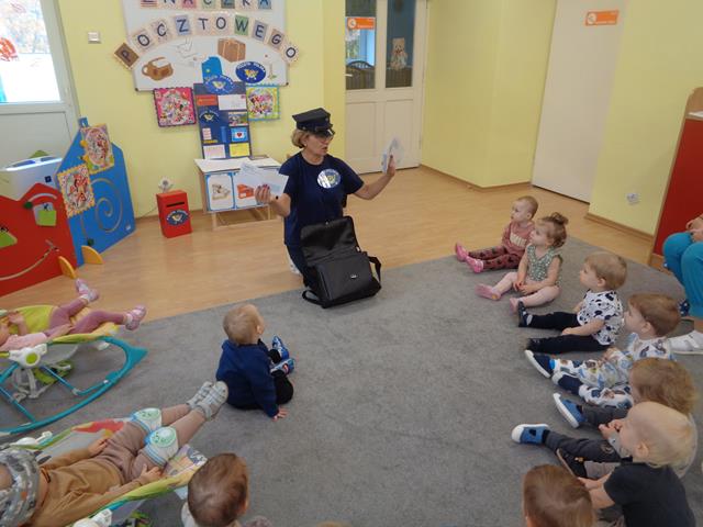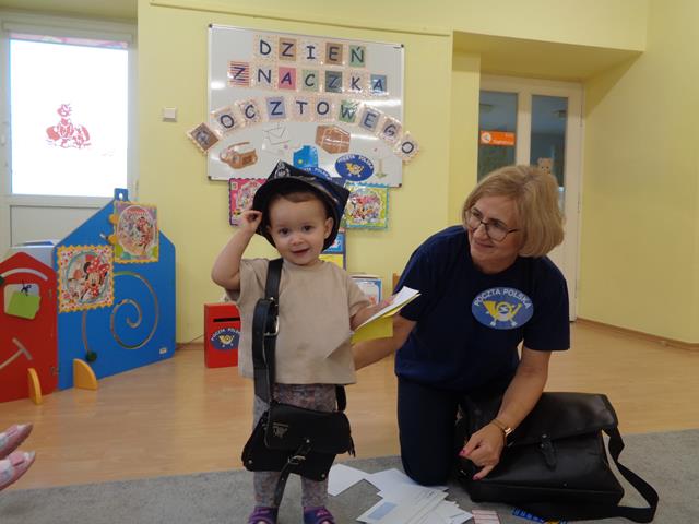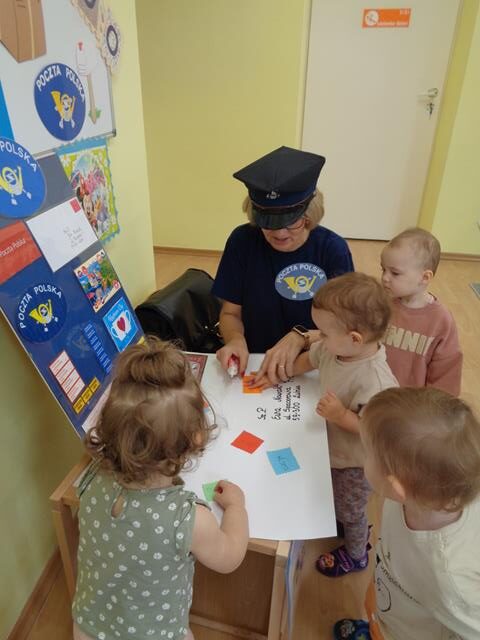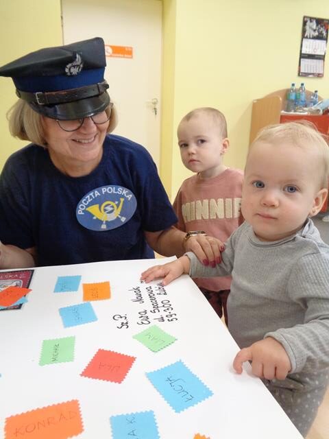 W czasie zajęć zabawowych maluszki dowiedziały się gdzie pracuje listonosz, jaki nosi ubiór (czapka, torba, koszulka) oraz czym się zajmuje. Dzieci chętnie brały udział w zabawie ruchowej “Listy roznoszę”, w czasie której rozwijaliśmy u maluszków poczucie rytmu. Dzieci z wielką radością ćwiczyły sprawność małych rączek poprzez przyklejanie i kolorowanie znaczków pocztowych oraz przybijanie pieczątek. Zabawa w pocztę bardzo spodobała się naszym maluszkom, a zajęcia upłynęły w miłej i wesołej atmosferze.