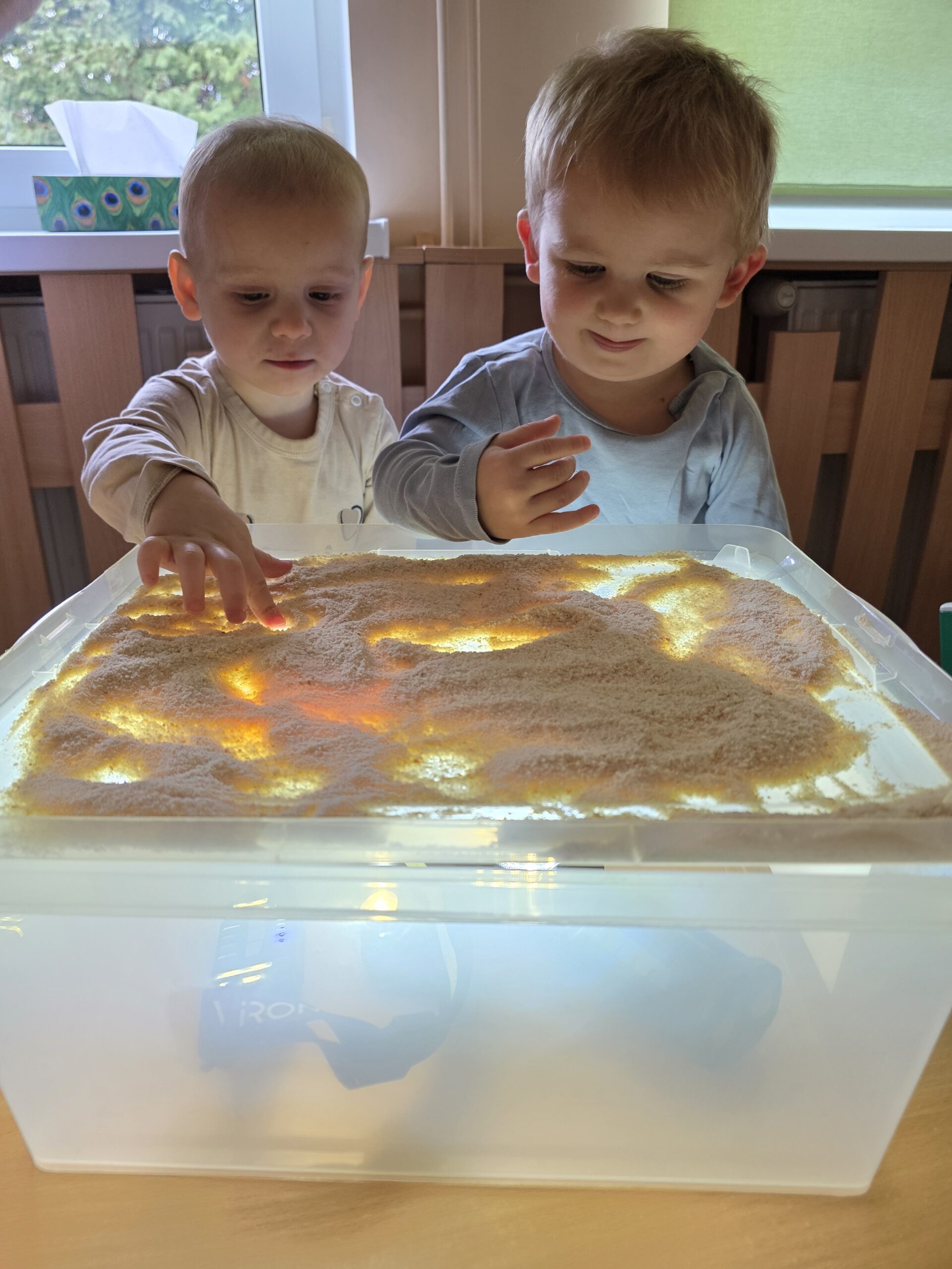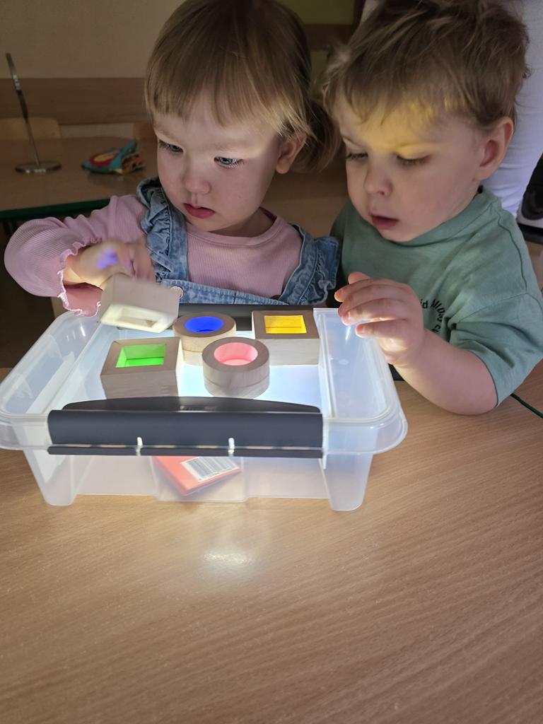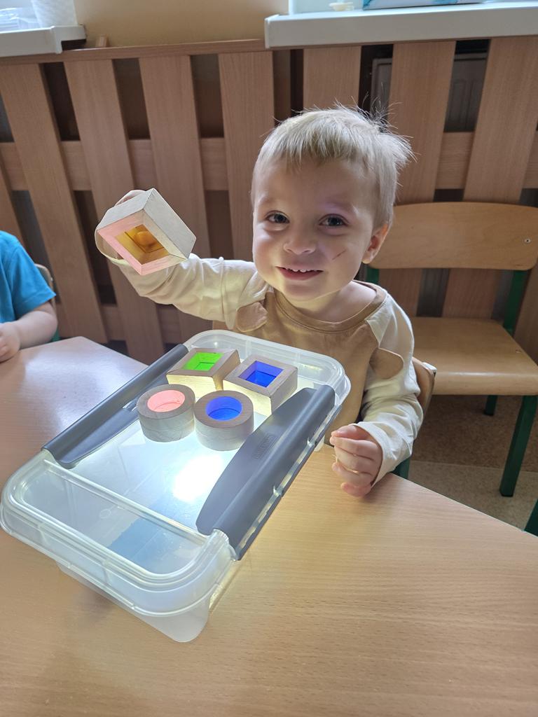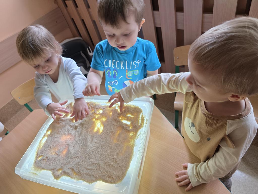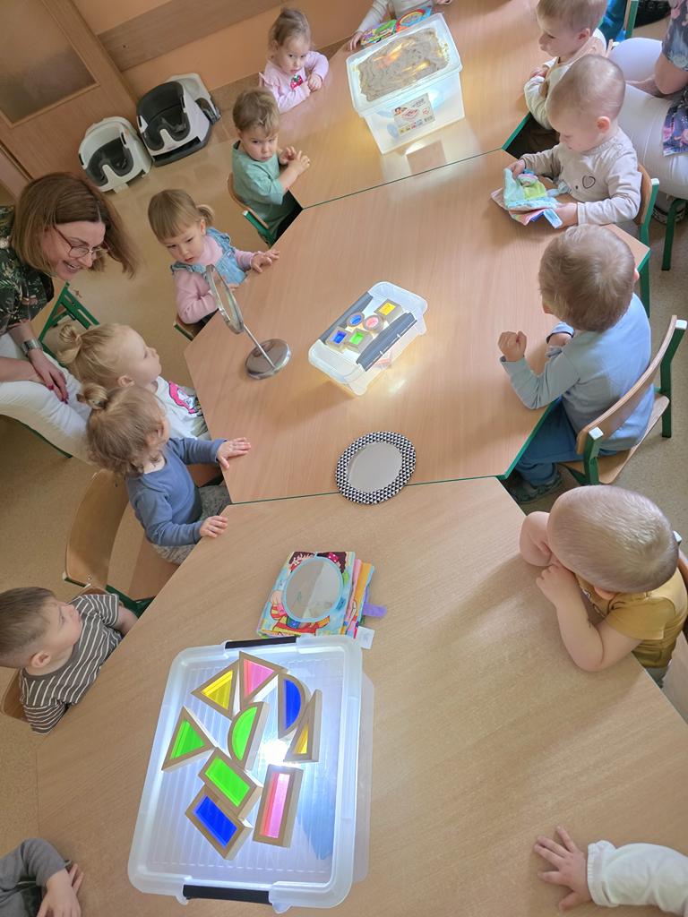 Dzieci z grupy II podczas zajęć sensorycznych okrywały zmysł wzroku. Zajęcia miały na celu stymulowanie mózgu, wspieranie rozwoju motorycznego, rozbudzenie ciekawości i pomoc w zrozumieniu otaczającego świata. Zabawy sprawiły maluszkom wiele radości i bardzo chętnie brały w nich udział.