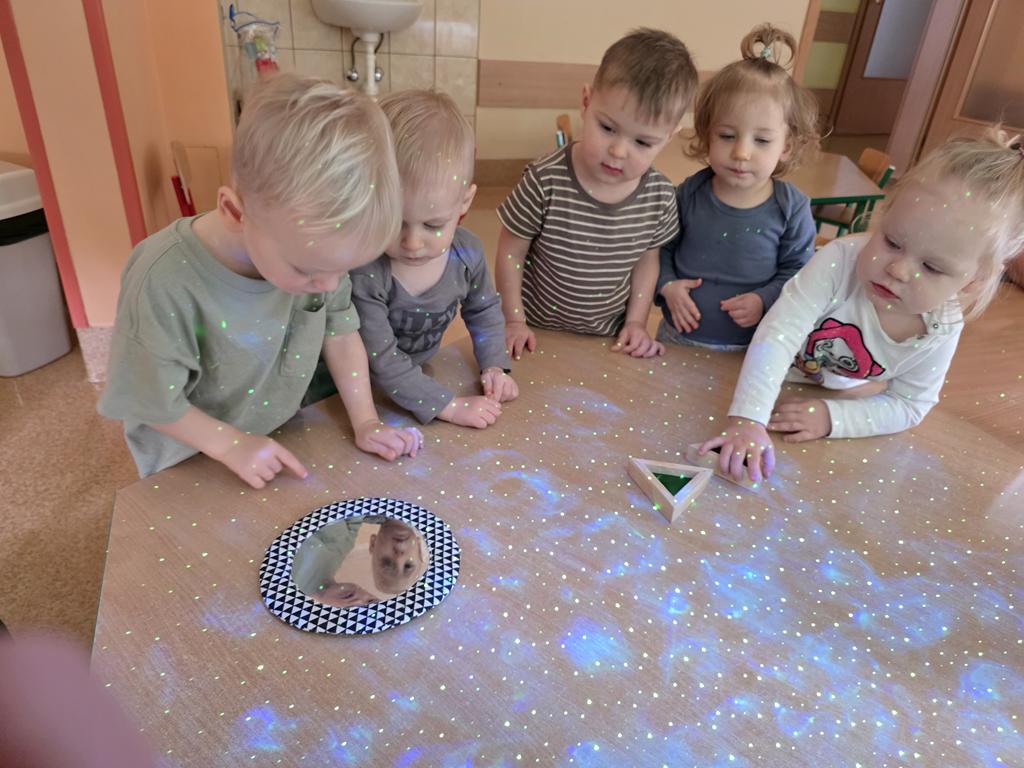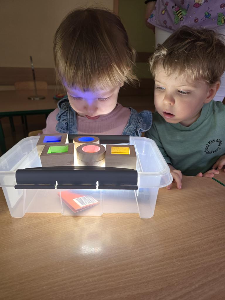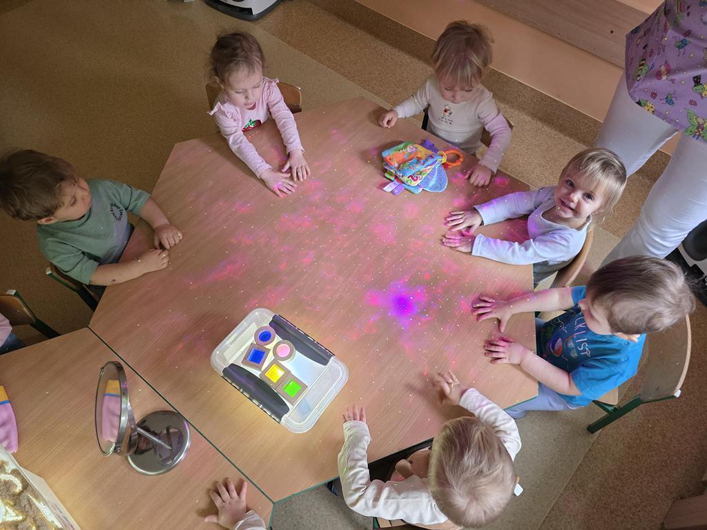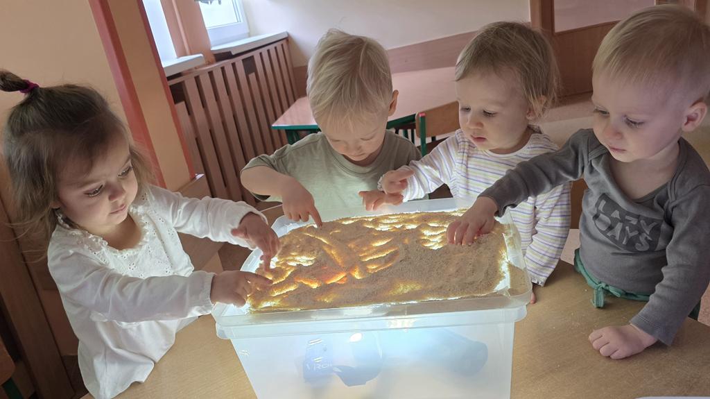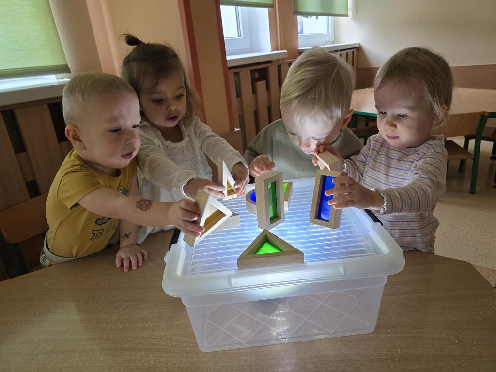 Dzieci z grupy II podczas zajęć sensorycznych okrywały zmysł wzroku. Zajęcia miały na celu stymulowanie mózgu, wspieranie rozwoju motorycznego, rozbudzenie ciekawości i pomoc w zrozumieniu otaczającego świata. Zabawy sprawiły maluszkom wiele radości i bardzo chętnie brały w nich udział.