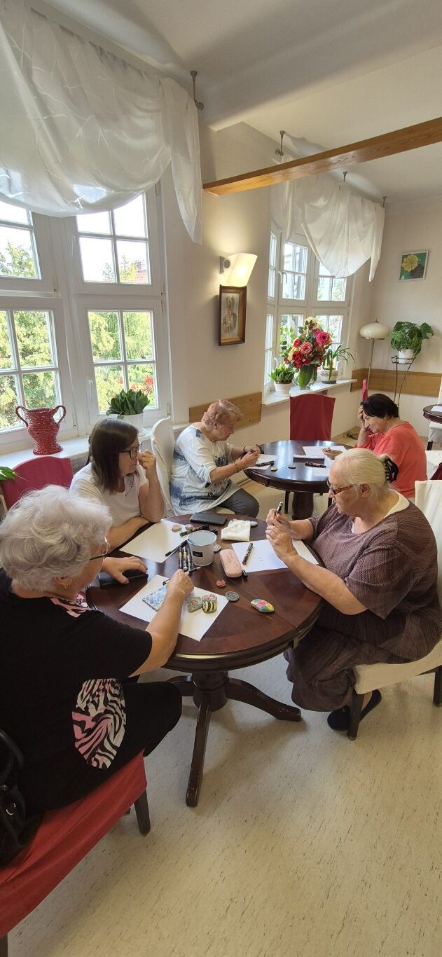 Po raz kolejny seniorzy mieli okazję rozwijać swoją kreatywność, malując kamyki. W miłej, swobodnej atmosferze powstały kolorowe wzory. Uczestnicy chętnie dzielili się pomysłami i pomagali sobie nawzajem. Na zakończenie powstała mini wystawa, na której każdy mógł podziwiać efekty wspólnej pracy. Kamyki wyruszą w podróż – niech niosą radość!