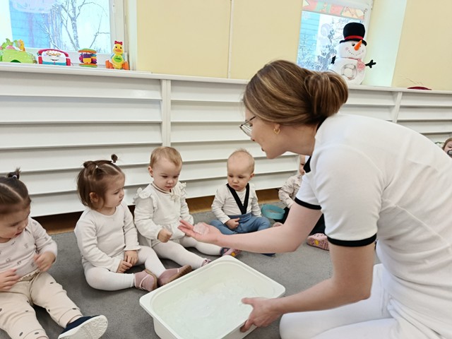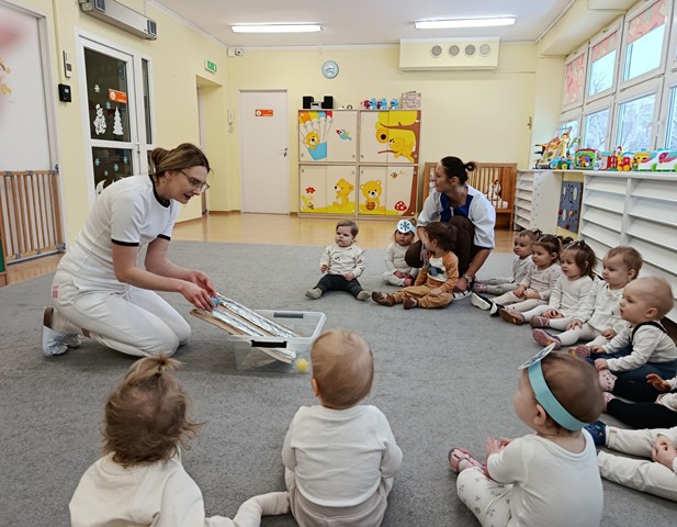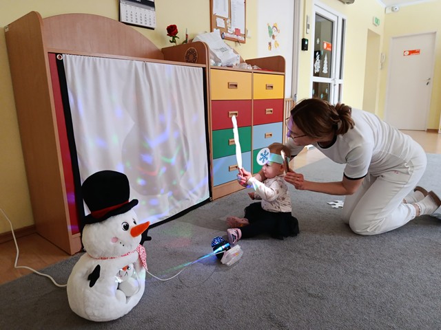 Zima stała się dla dzieci wspaniałą inspiracją do wspólnych zabaw i twórczych działań. Maluszki z radością uczestniczyły w zimowej sensoplastyce, malowały śnieżny krajobraz metodą stemplowania oraz eksperymentowały z farbami i lodem. Dużo uśmiechu i zaciekawienia przyniosły zabawy badawcze z zamrożonymi zwierzątkami na lodowym torze oraz wspólne tworzenie bałwanka z produktów spożywczych. Szczególną atrakcją był zimowy teatr cieni, który dostarczył dzieciom wiele radości, pobudził wyobraźnię i kreatywność, a także sprzyjał integracji grupy. Całość dopełniły zabawy muzyczno-ruchowe przy piosenkach pt. „Bałwankowa rodzina”, „Bałwanki maszerują”, rozwijające koordynację ruchową i zachęcające do wspólnej zabawy.