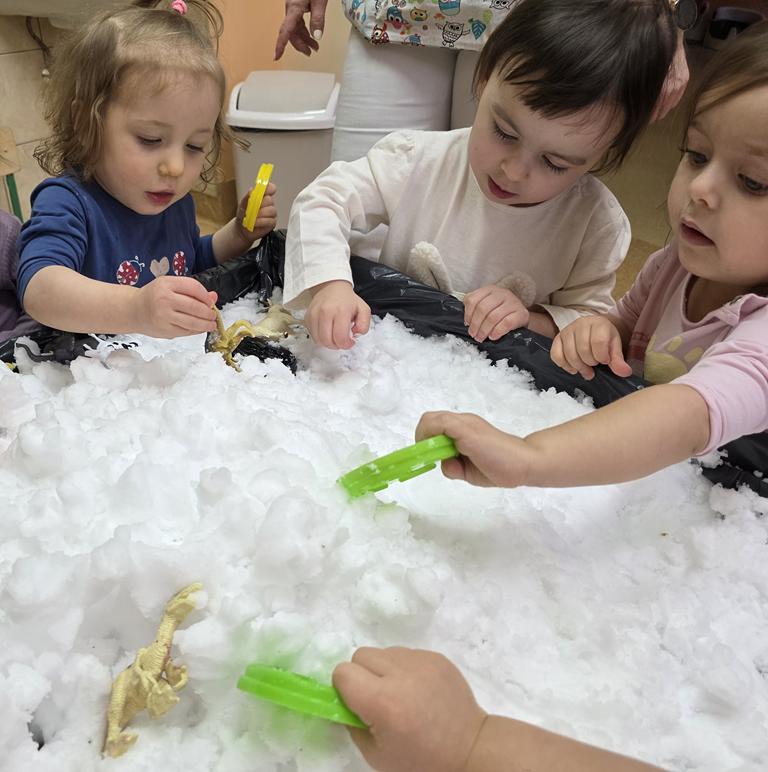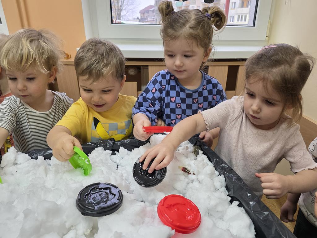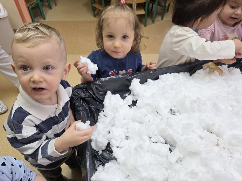 Podczas zajęć badawczych poznały właściwości śniegu i zaobserwowały, że jest on zimny, mokry i miękki.