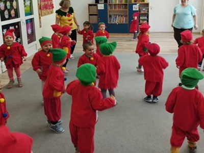 Z tej okazji dzieci w czerwonych czapeczkach tańczyły wesoło do piosenek o muchomorku. Maluszki z