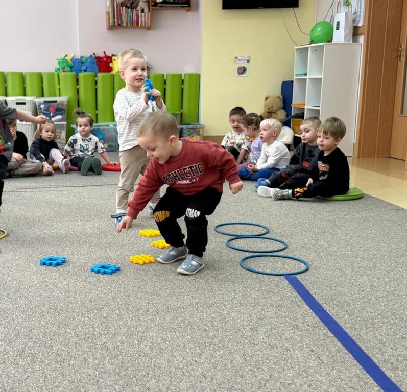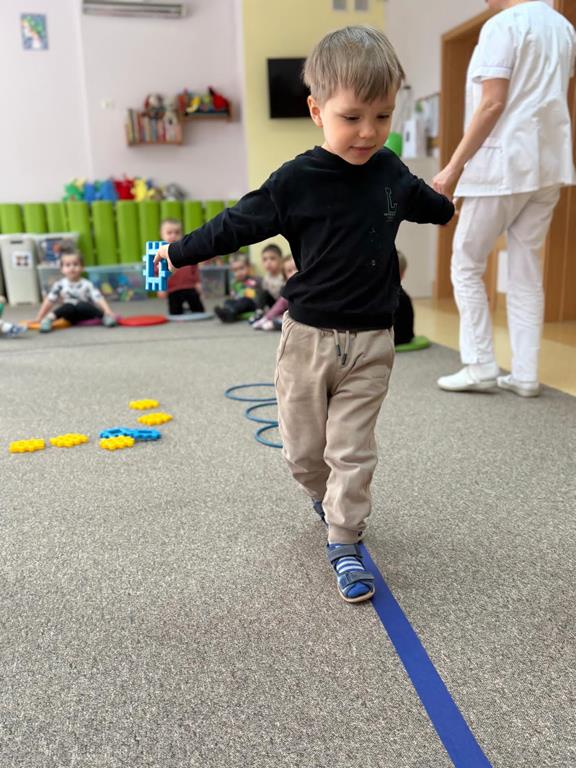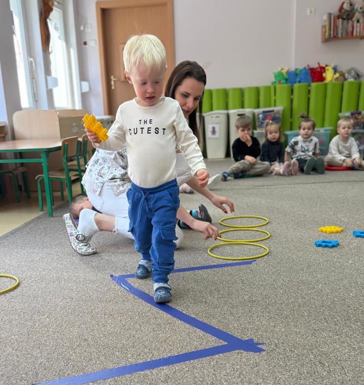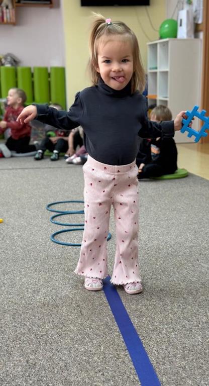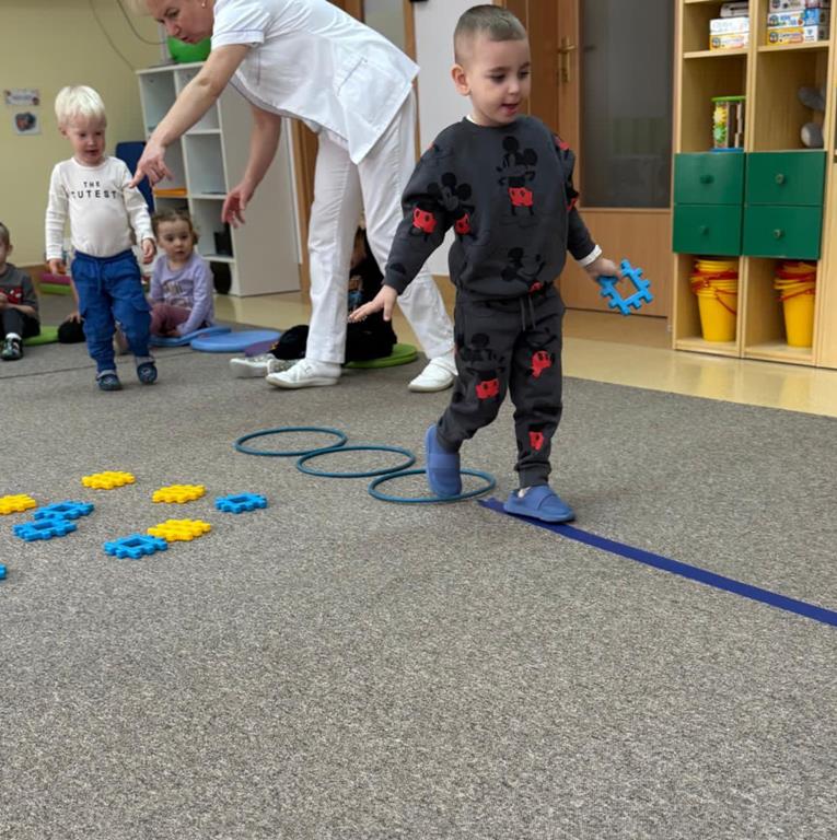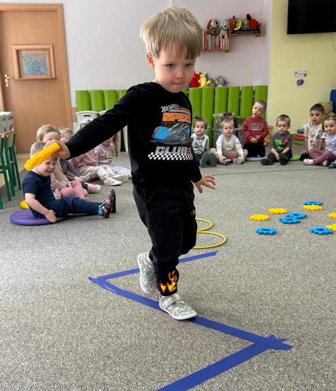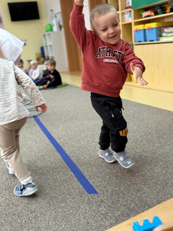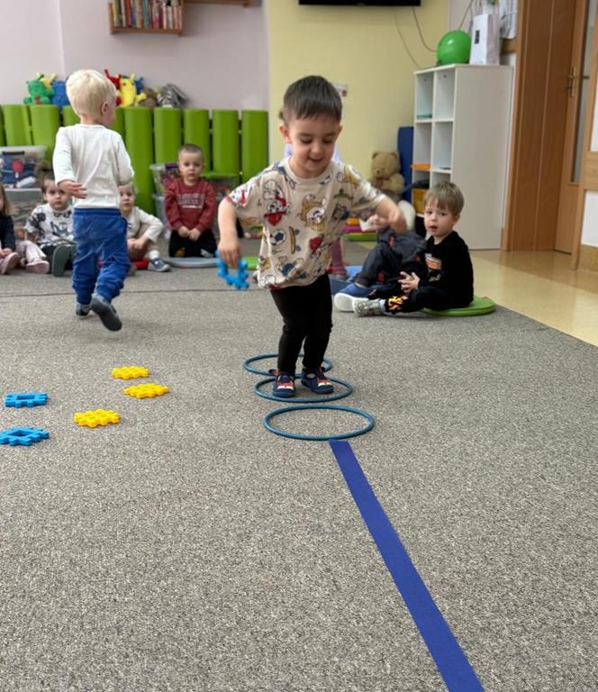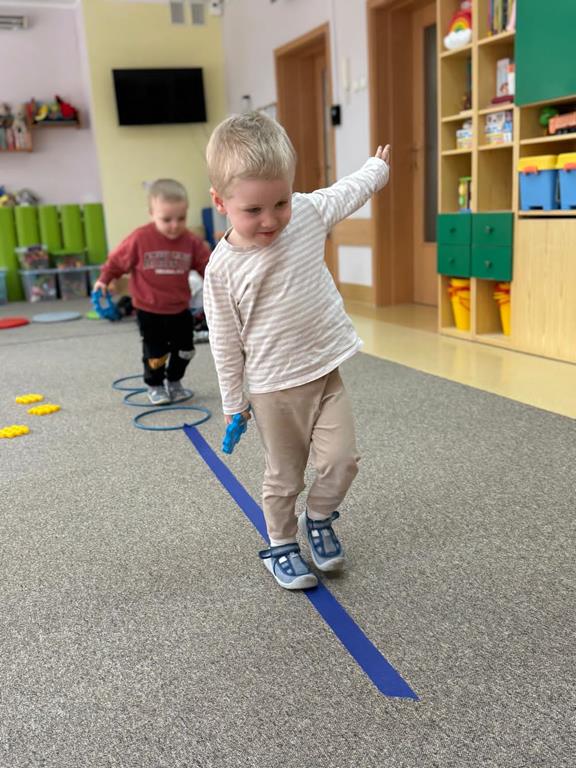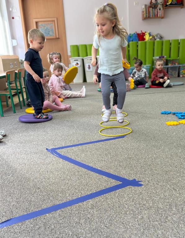 Głównym elementem aktywności w tym dniu był tor przeszkód, który wymagał od naszych uczestników przechodzenia po wyznaczonej ścieżce, podskakiwania i utrzymania stabilnej równowagi.