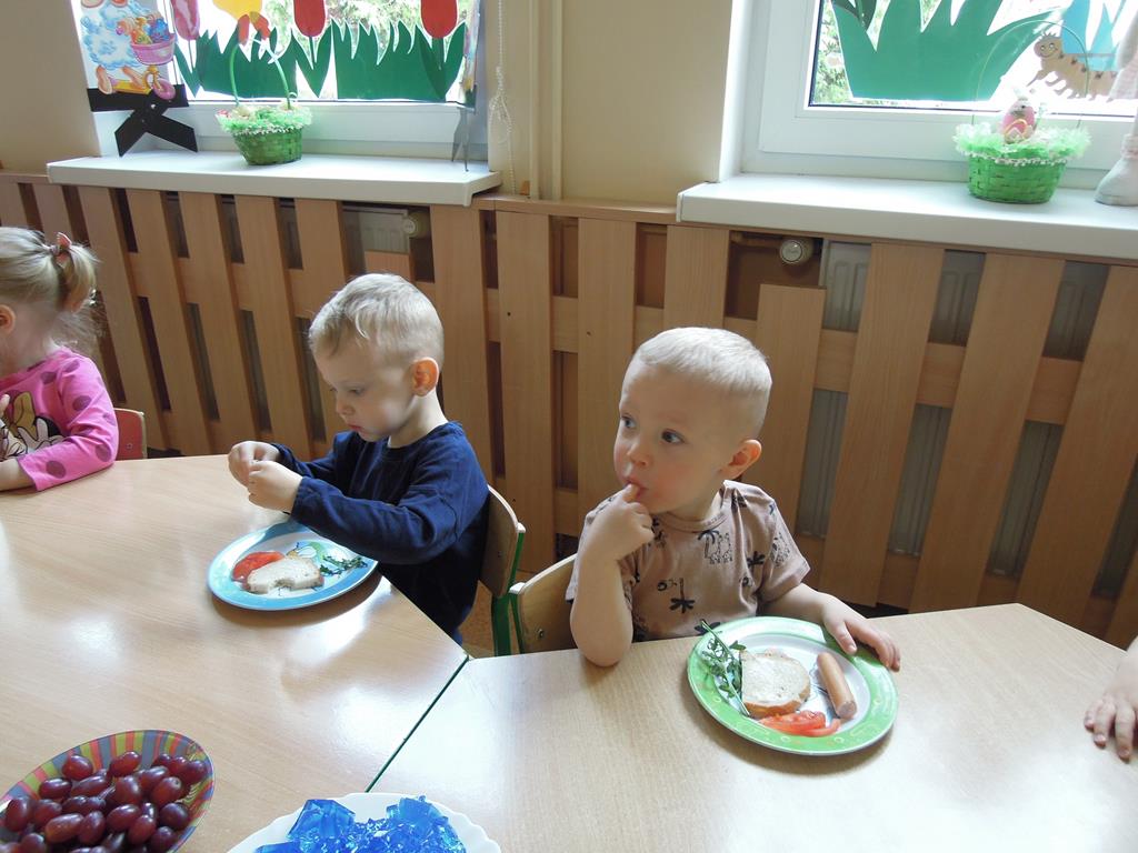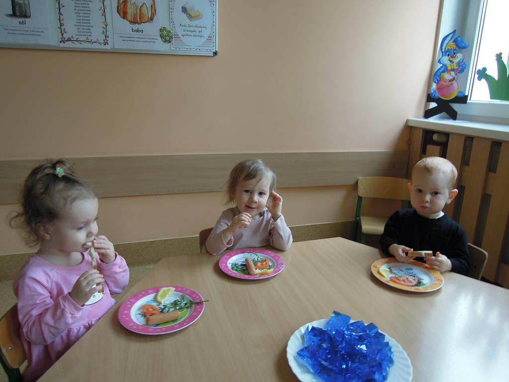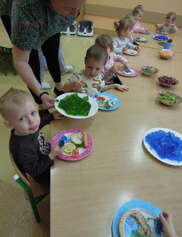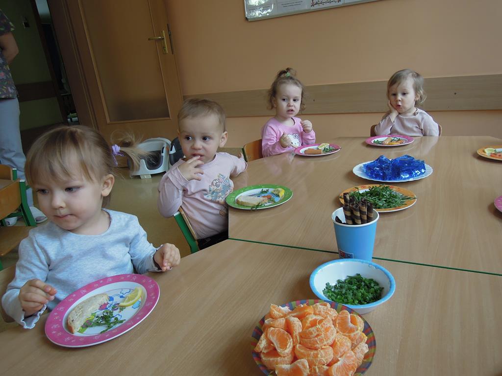 Nasze Krasnale podczas śniadania miały możliwość próbowania różnych produktów – świeżych owoców, warzyw, galaretek, kwaśnej cytryny a nawet słodkich ciastek.