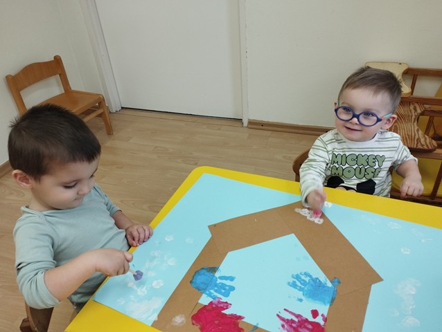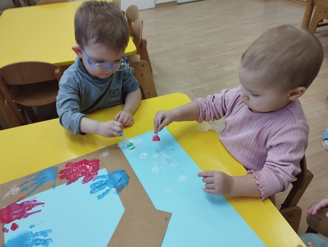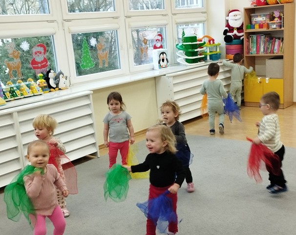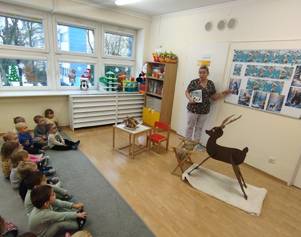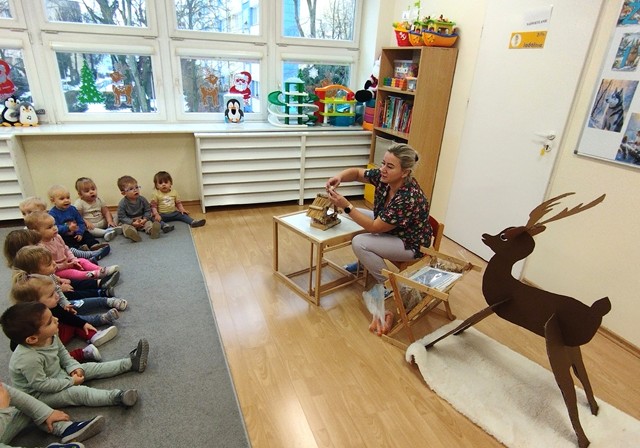 Podczas zajęć zabawowych w grupie Kaczuszek dzieci odkrywały tajniki życia leśnych zwierząt i ptaków, uczyły się, jak im pomóc przetrwać zimę. Maluszki z zaciekawieniem oglądały na ilustracjach zimowych mieszkańców lasu, a nawet miały okazję „nakarmić” jelonka chrupiącą marchewką. Dzieci zobaczyły jak wygląda karmnik i dowiedziały się co możemy do niego nasypać. Nie zabrakło też radosnych zabaw ruchowych – dzieci używając chusteczek naśladowały fruwające ptaszki. Na zakończenie zabaw nasi podopieczni stworzyli piękne prace plastyczne: za pomocą dłoni wyczarowali kolorowe ptaszki, a pędzelkami z gąbką namalowali puszysty śnieżek.